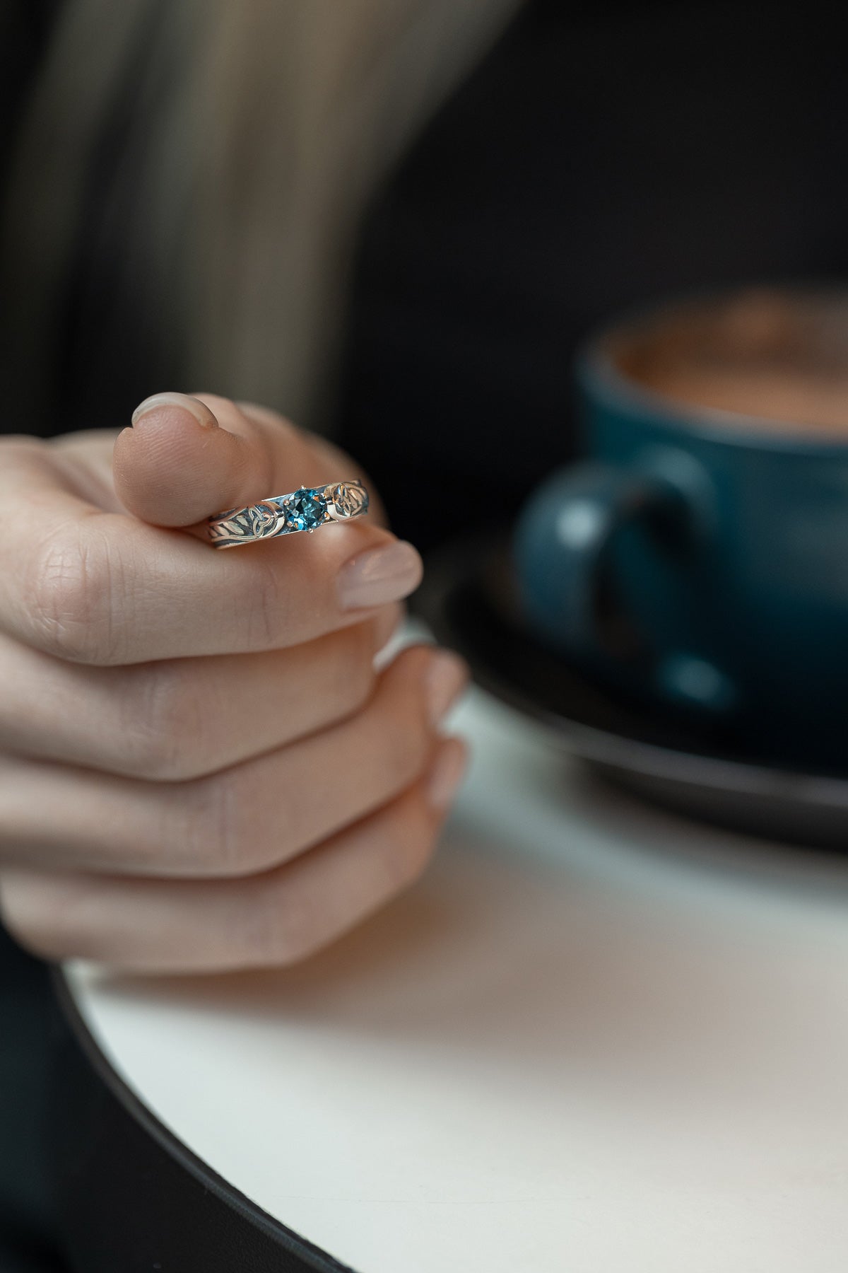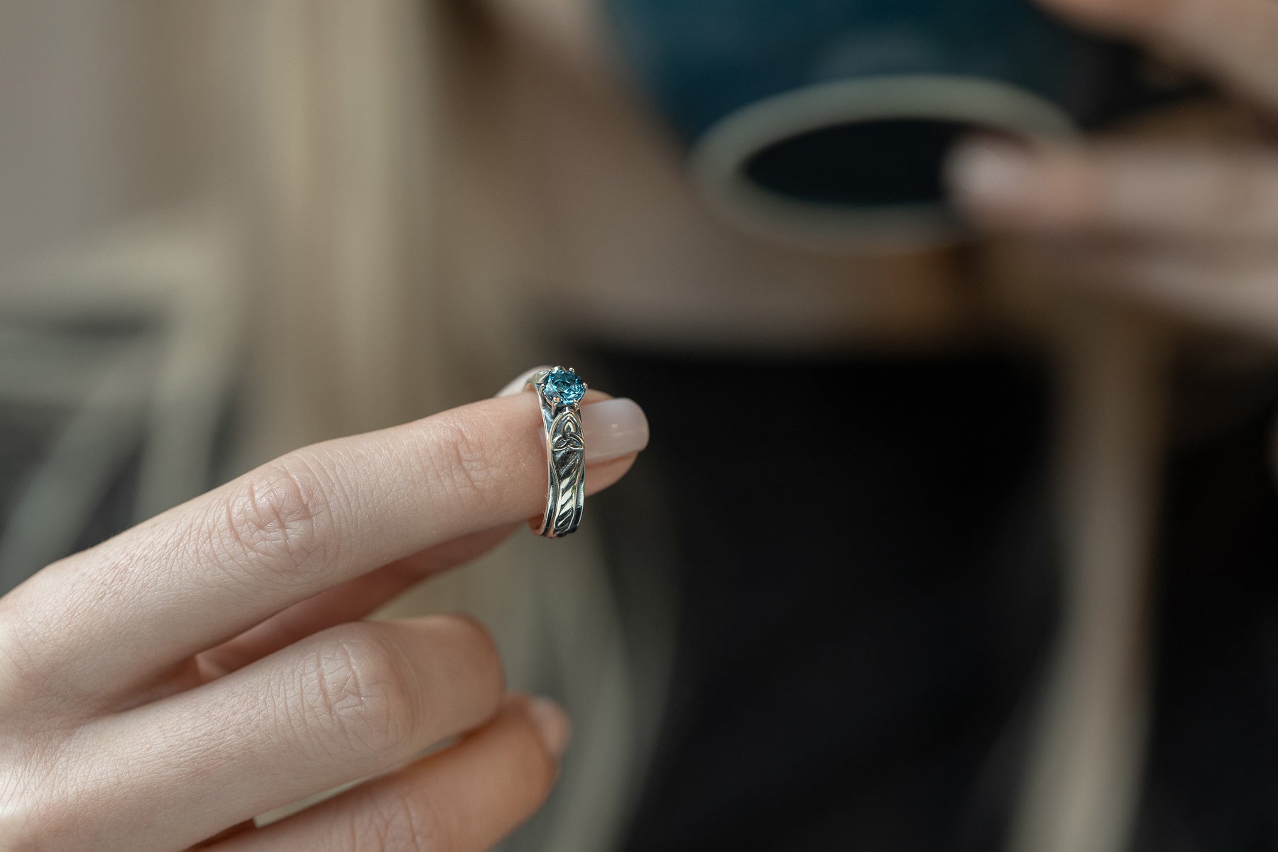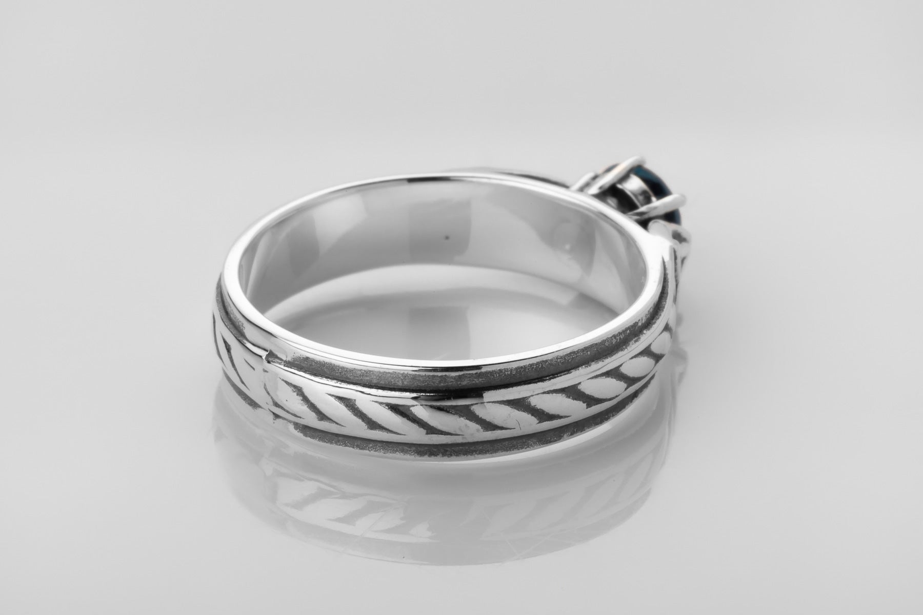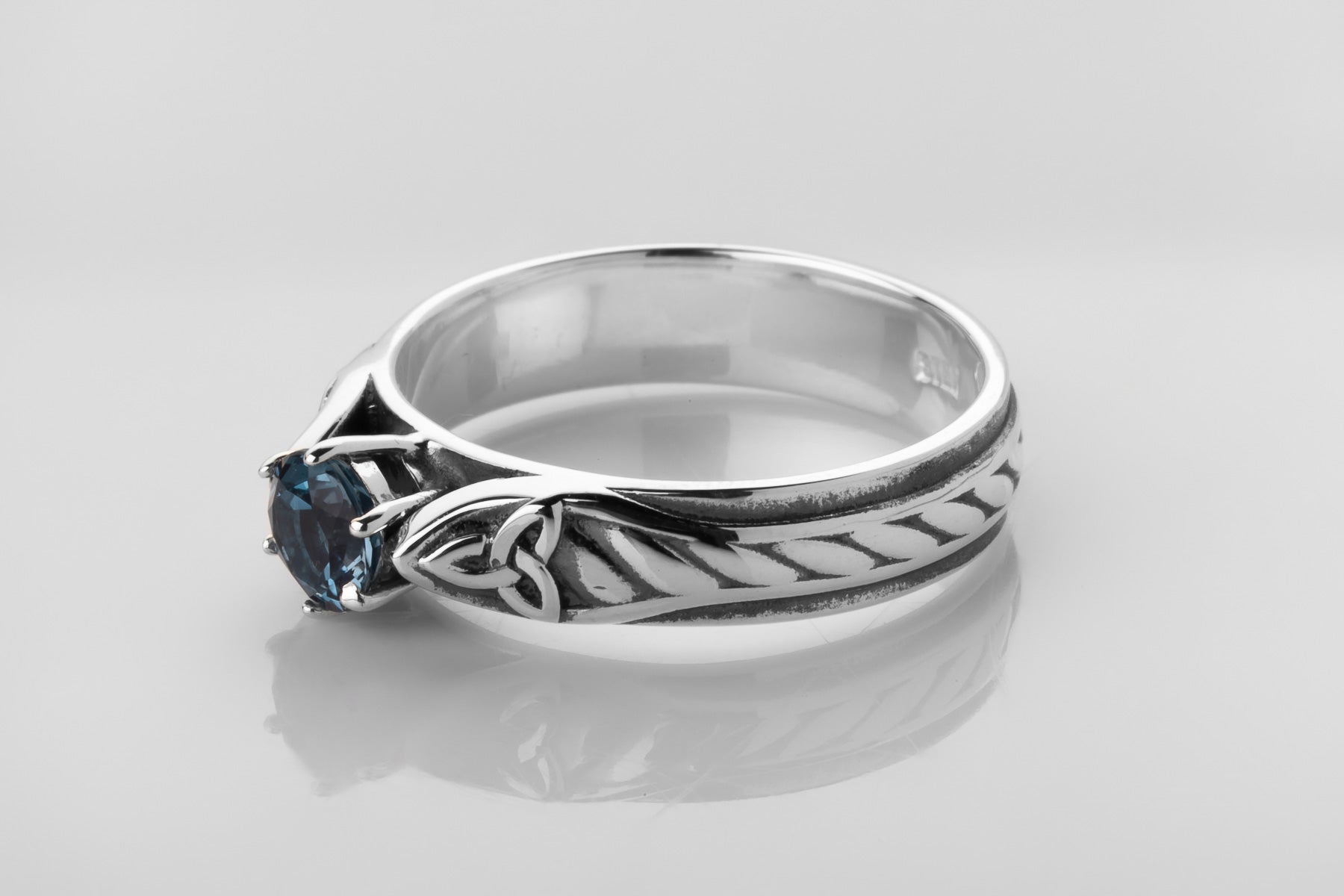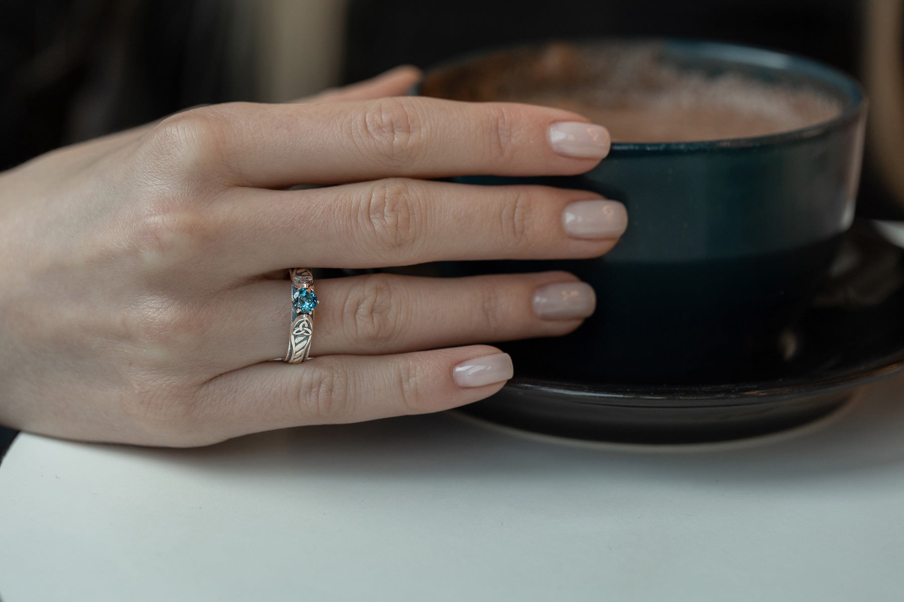 Its intricate design adds elegance and meaningful detail to this sterling silver ring, accented with a vibrant blue London Topaz.