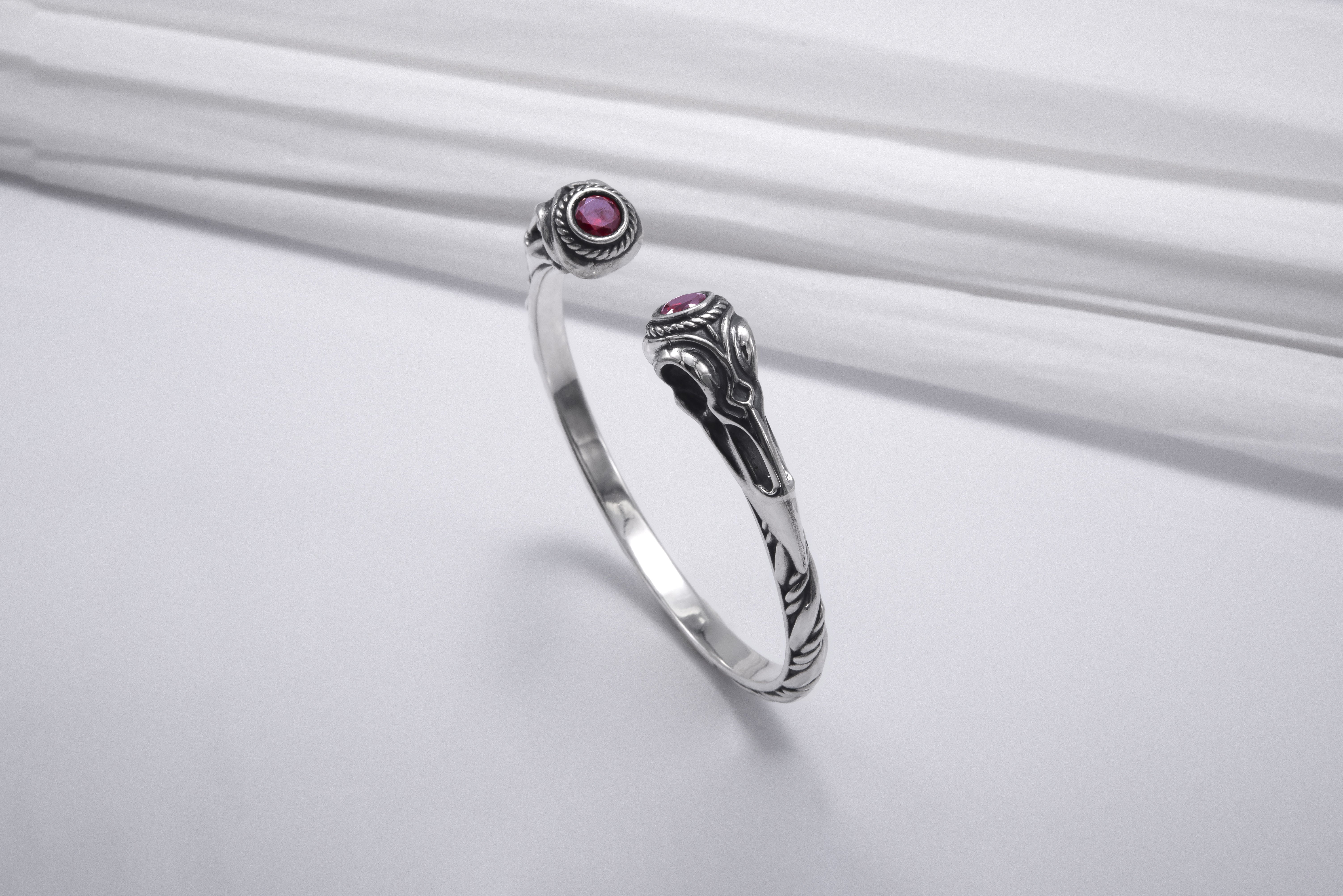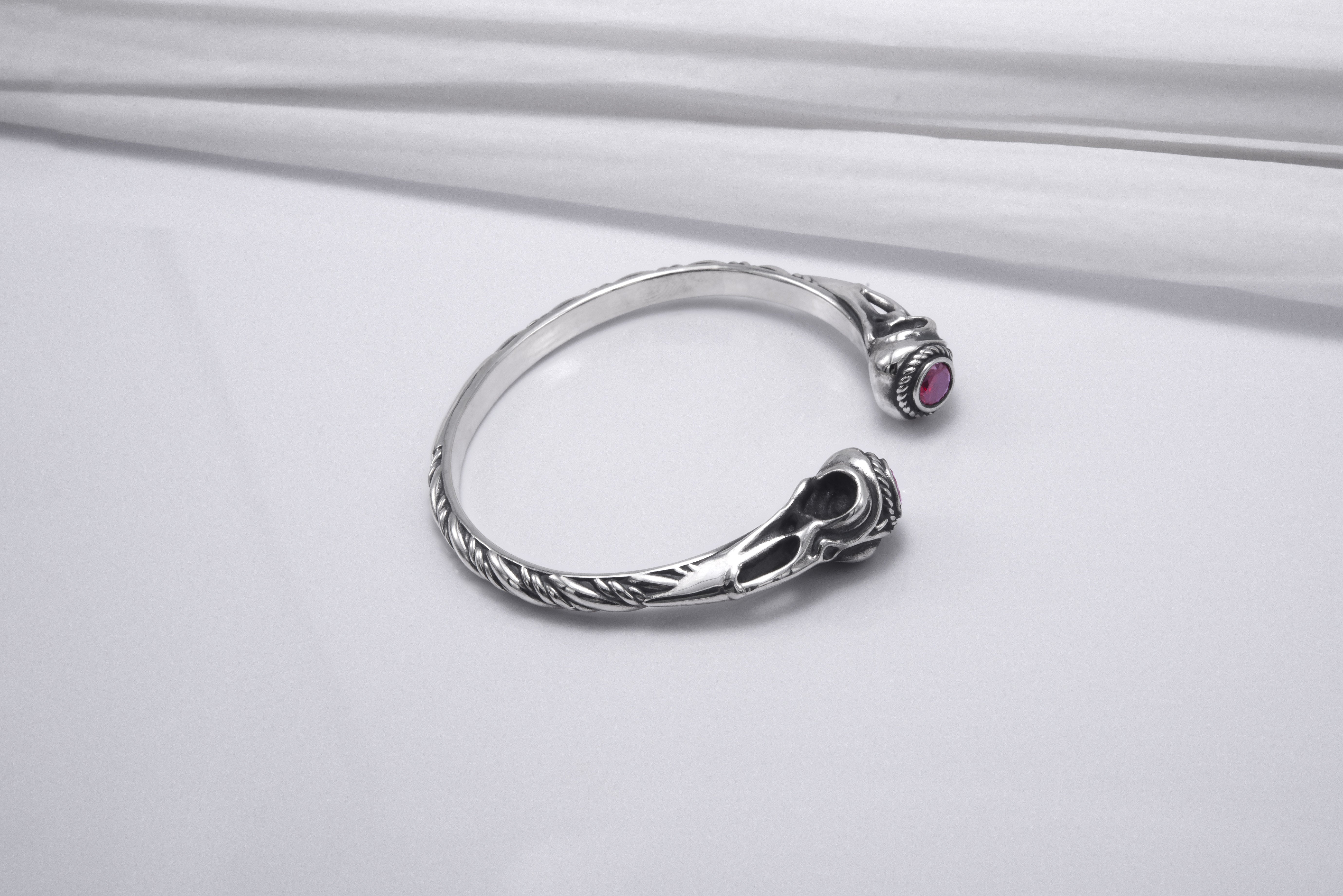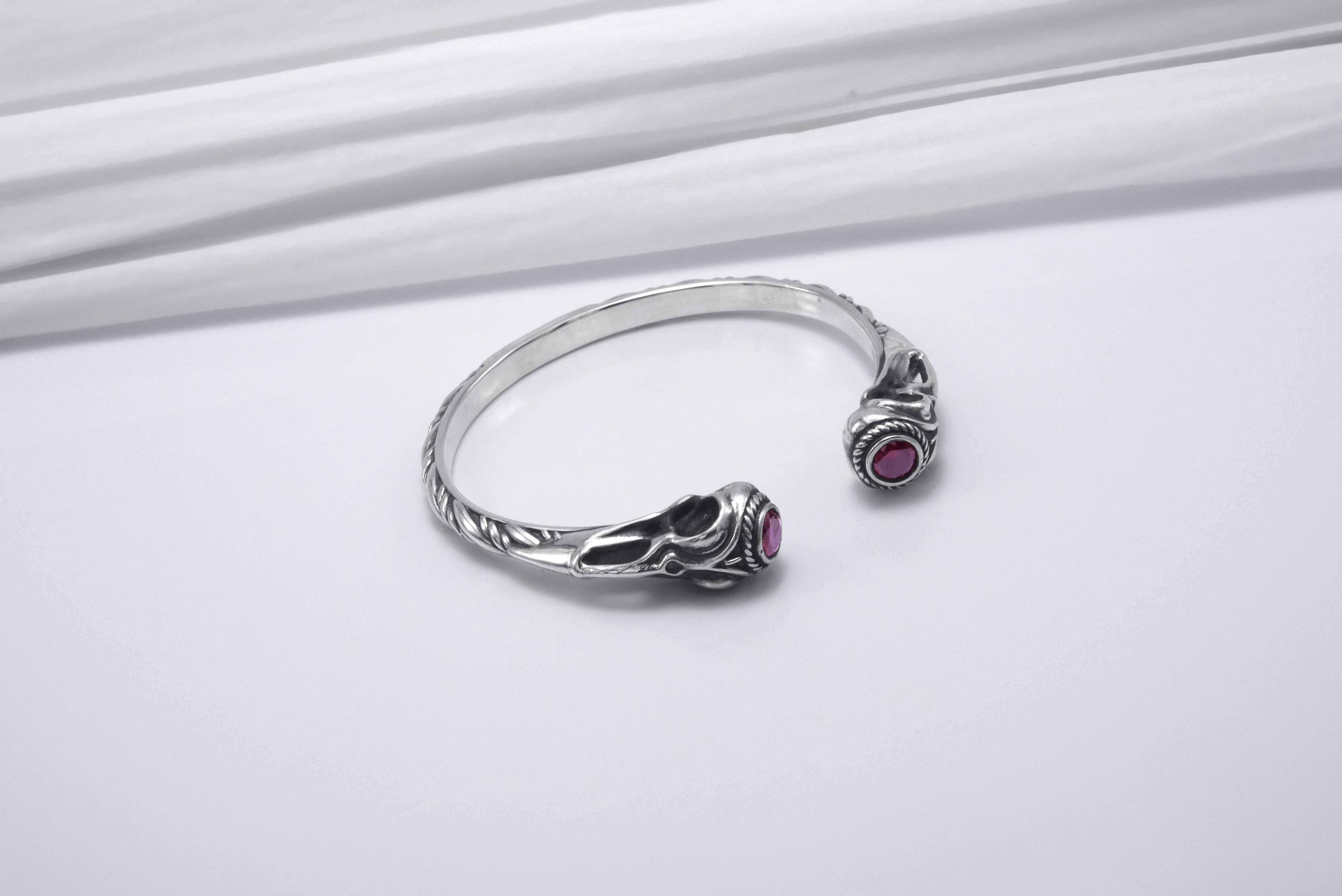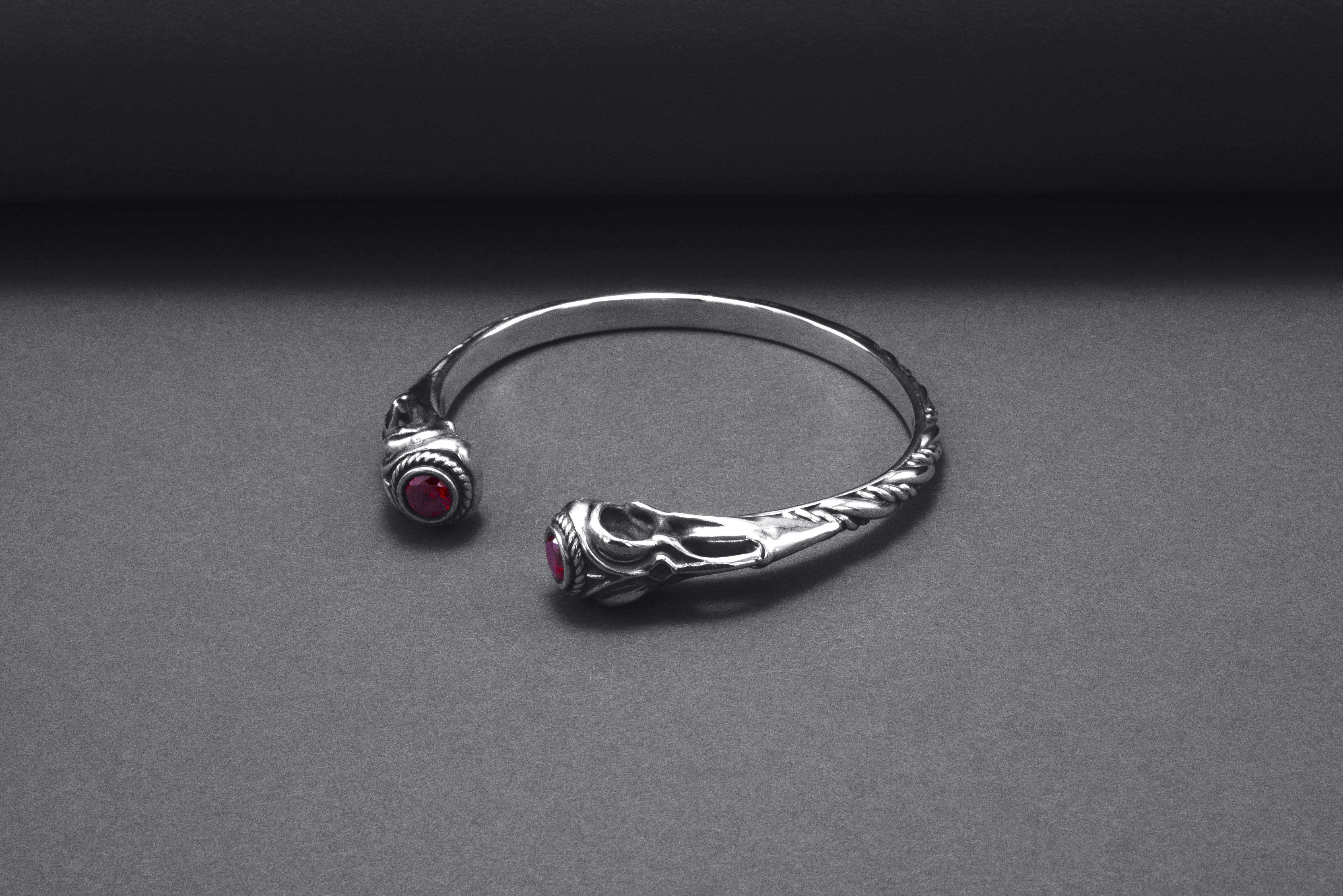925 Silver Raven Skulls Bracelet with Red Gems, Unique Handmade Jewelry