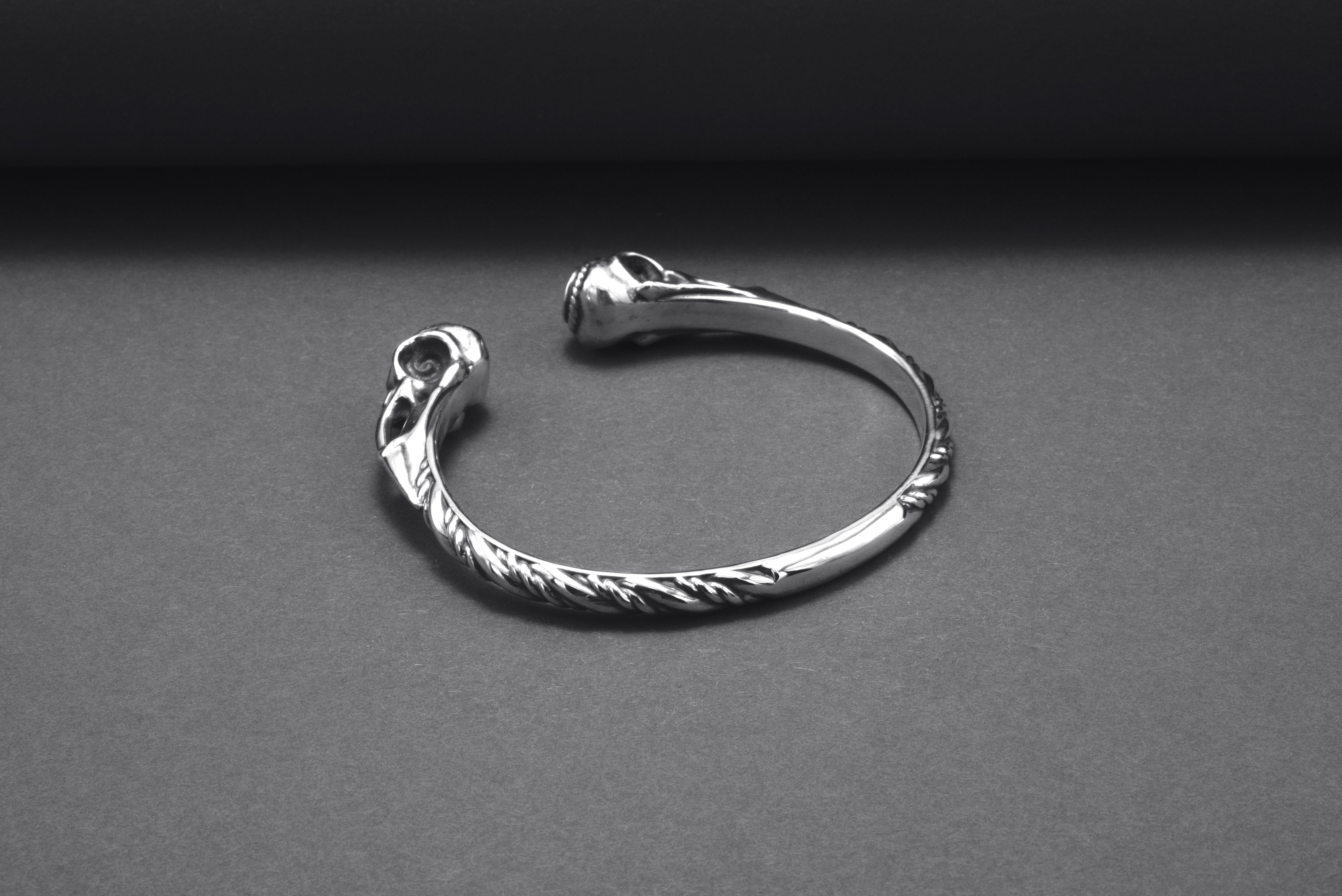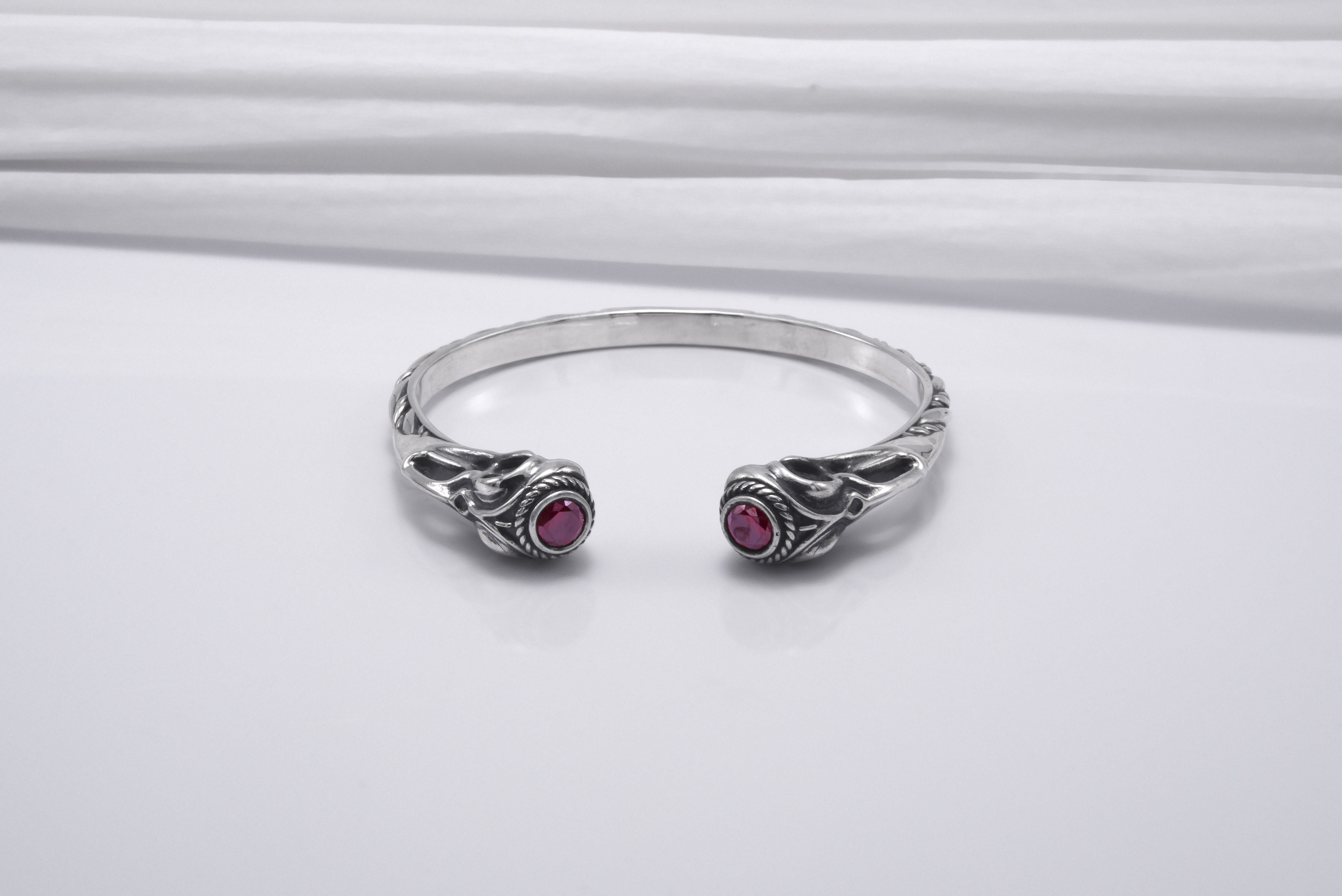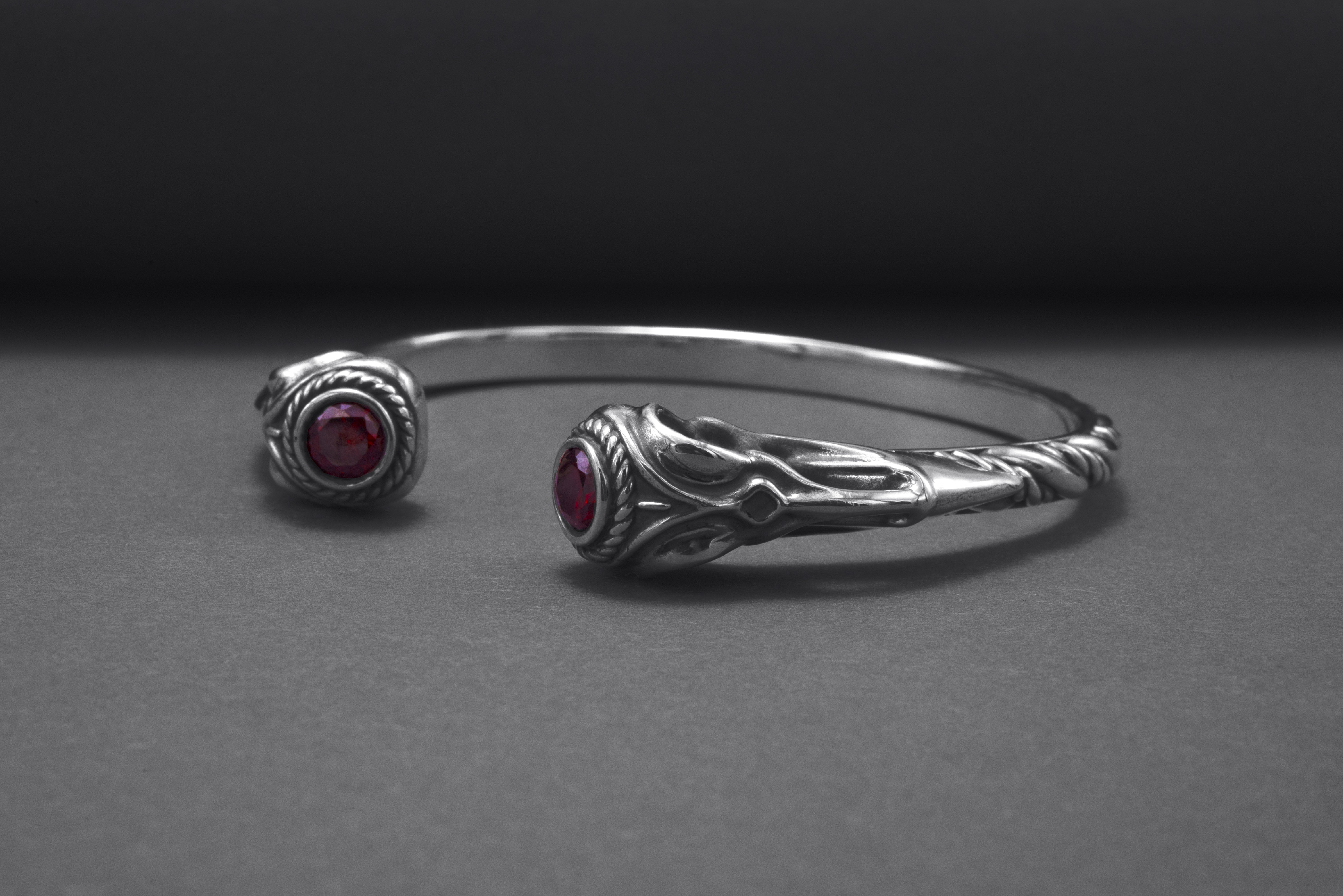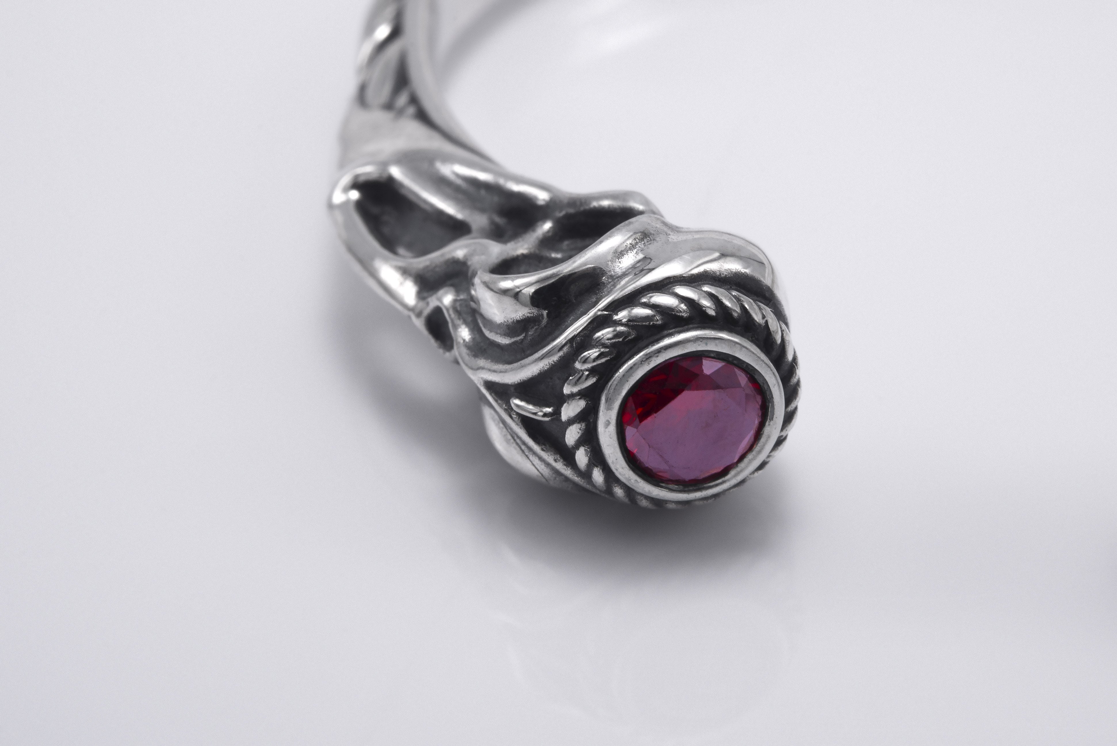 925 Silver Raven Skulls Bracelet with Red Gems, Unique Handmade Jewelry