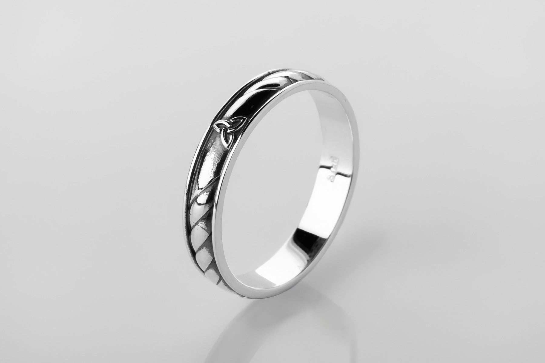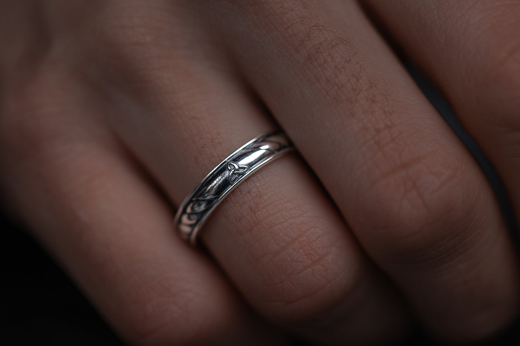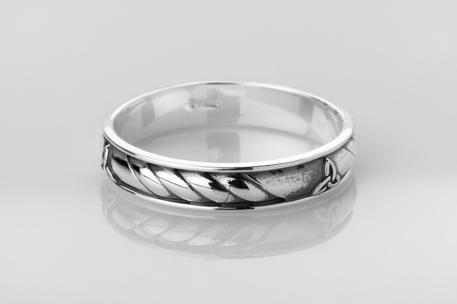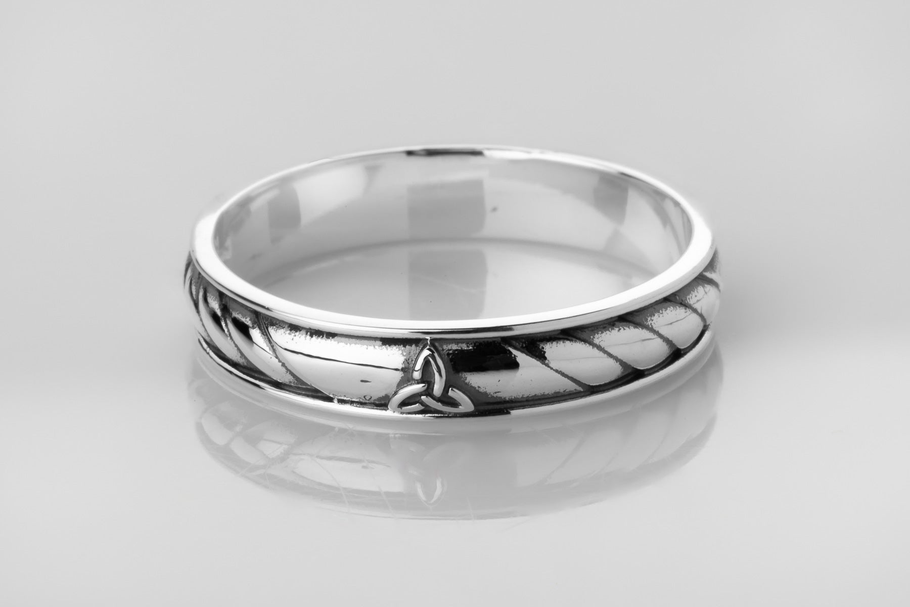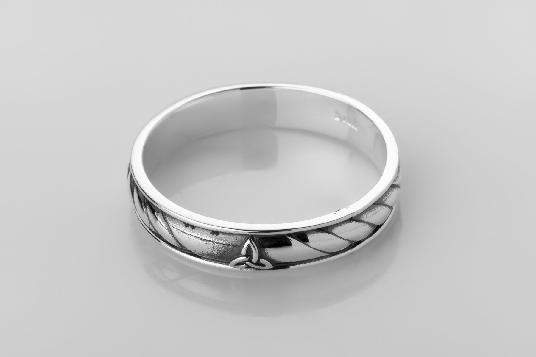 This sterling silver Celtic knot ring features the Triquetra, an ancient Celtic symbol. It represents love, loyalty, and unity. Its intricate knotwork is highlighted by the broader surface, emphasizing craftsmanship and detail.