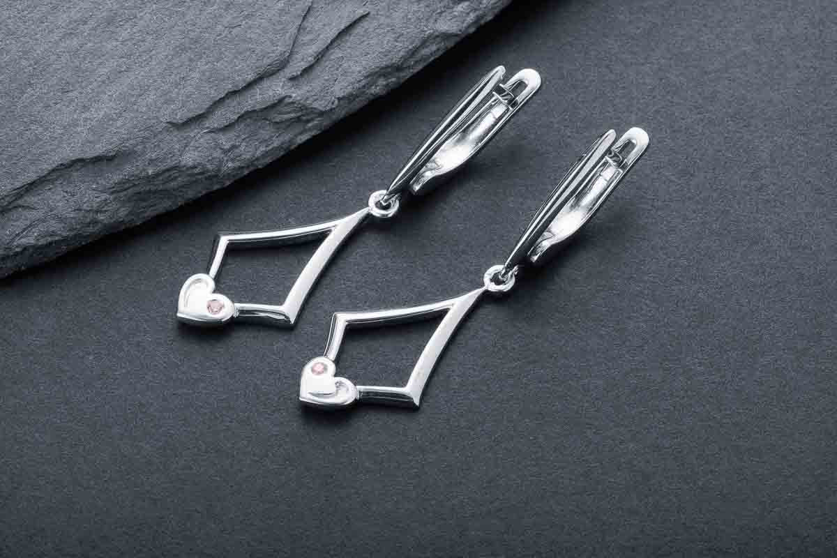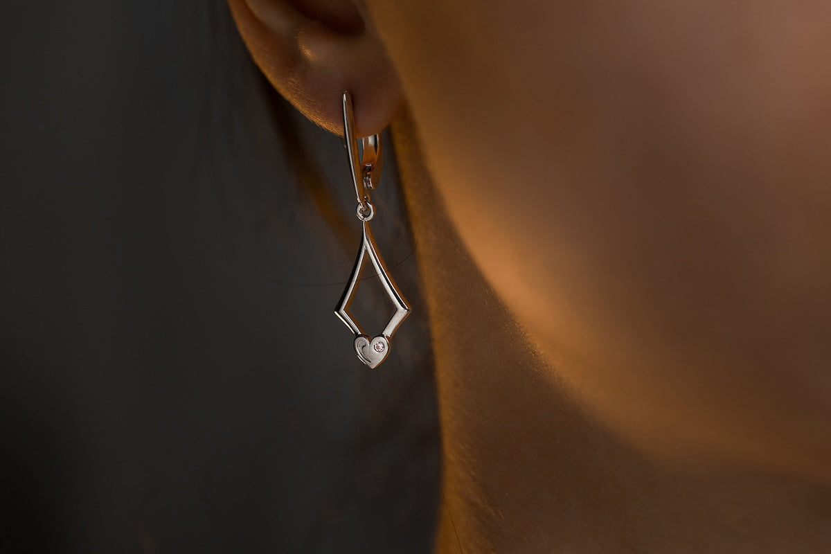 Silver geometric drop earrings with a heart accent. Light, modern, and architecturally refined.
