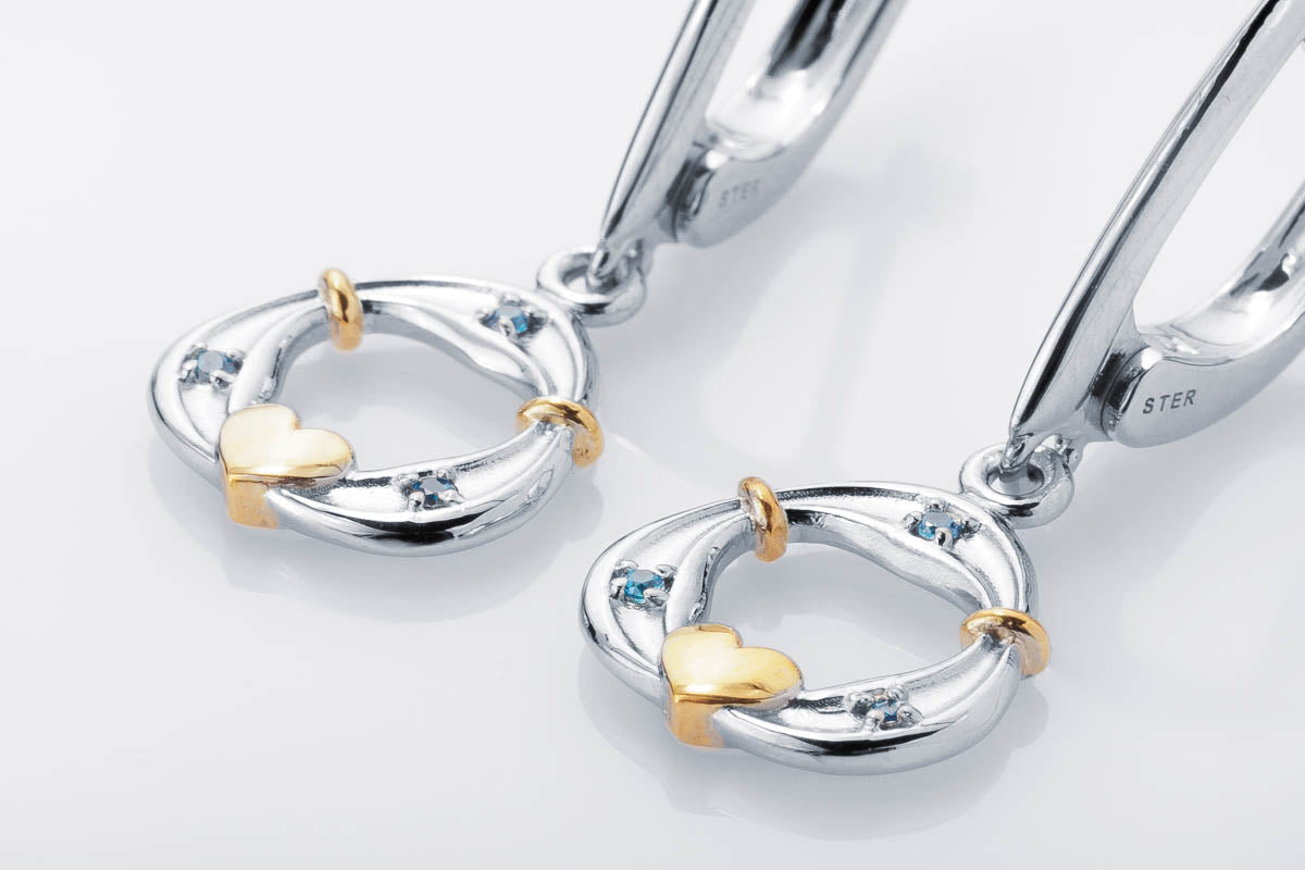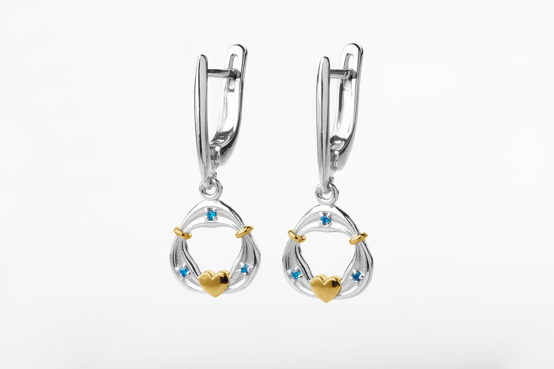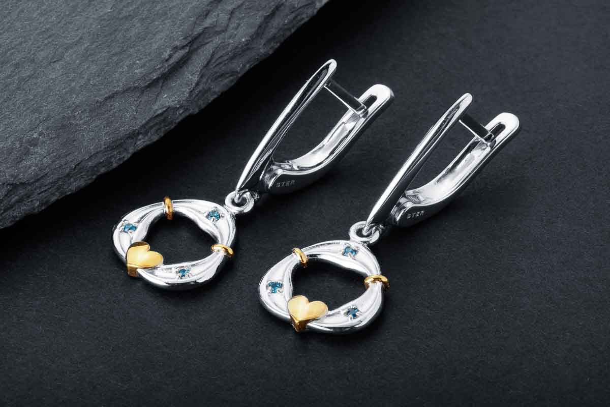 Silver hoop earrings featuring blue stones, subtle gold accents, and a heart motif.