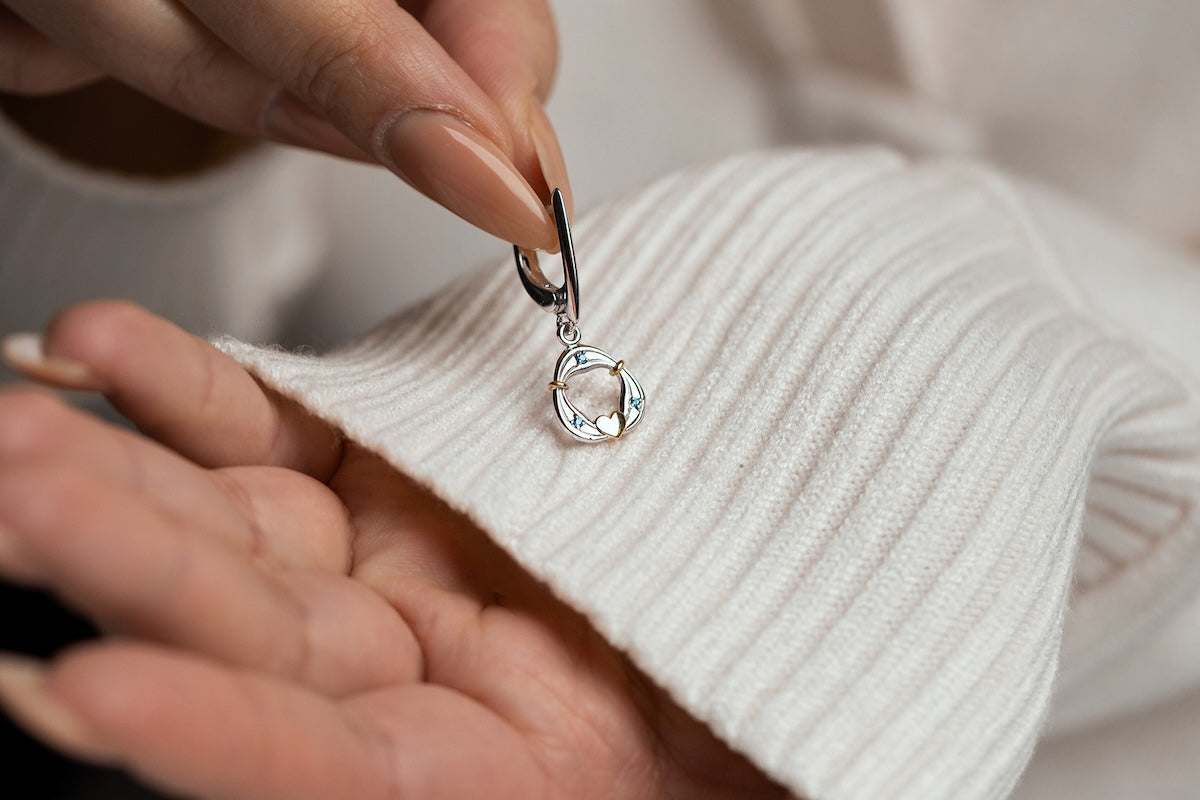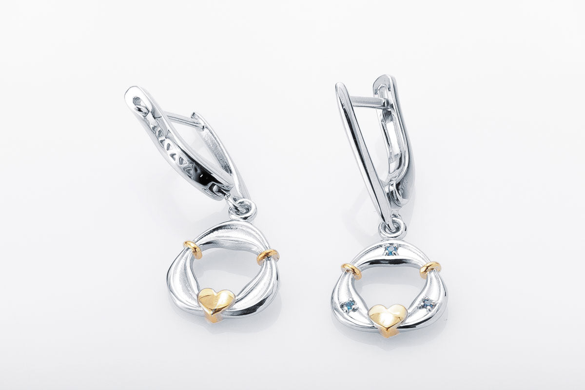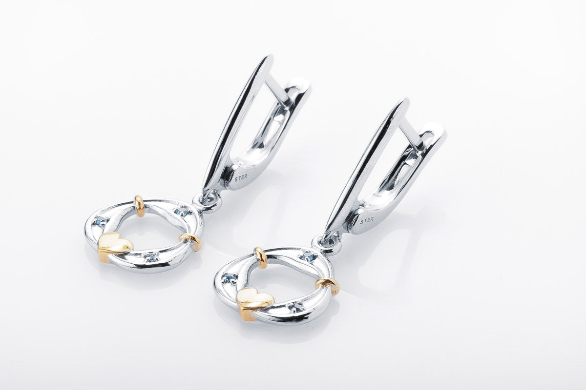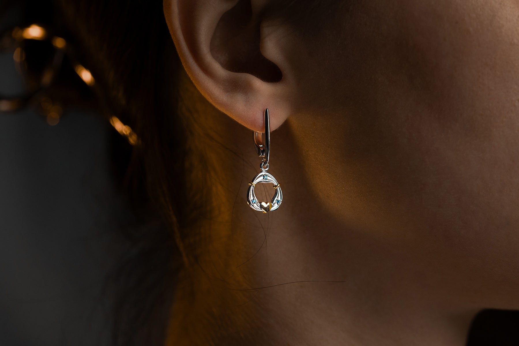 Silver hoop earrings featuring blue stones, subtle gold accents, and a heart motif.