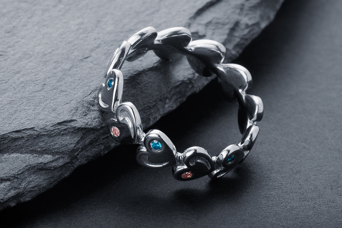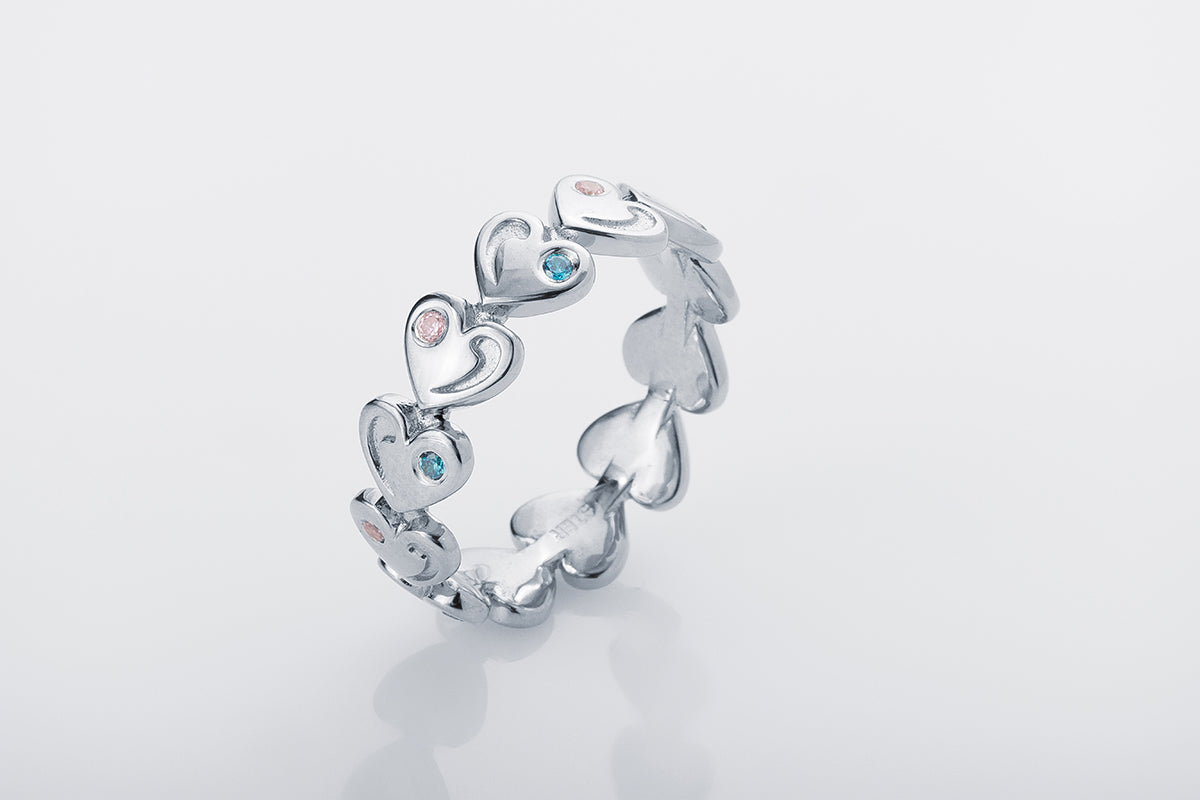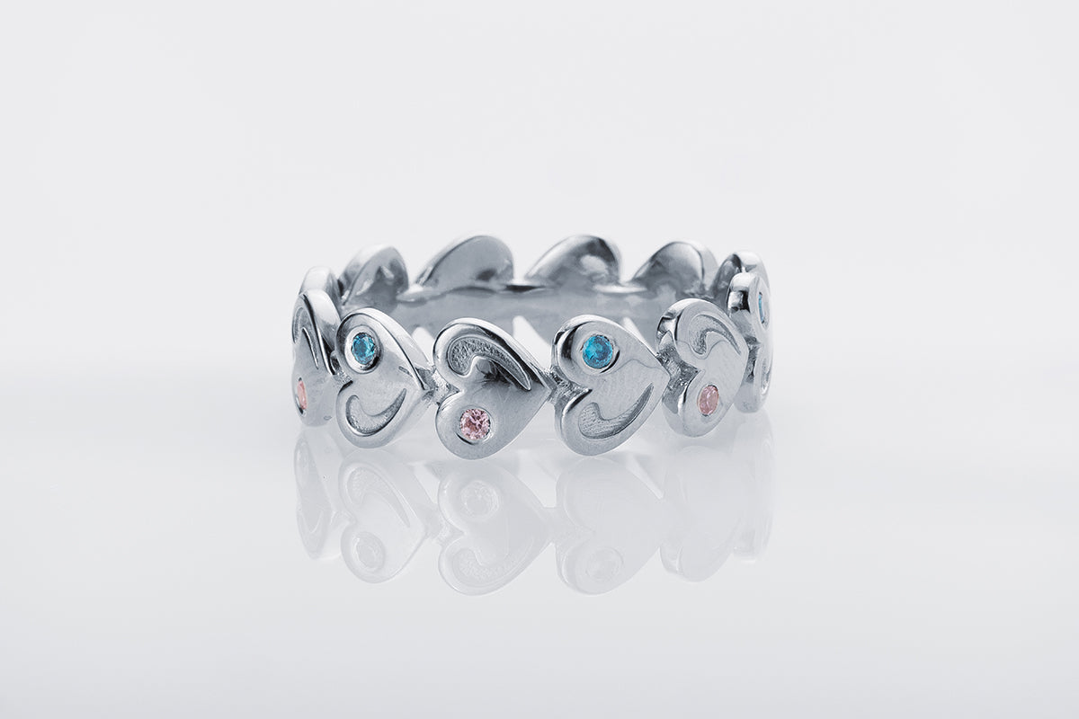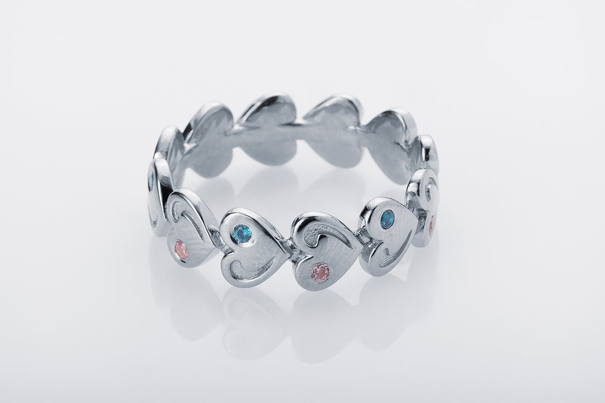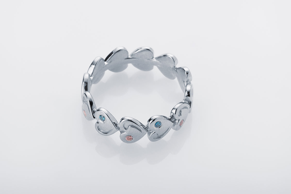 A silver ring with repeating heart-shaped elements and inlays of soft pink and blue stones. A distinctive rhythm and exquisite finish.