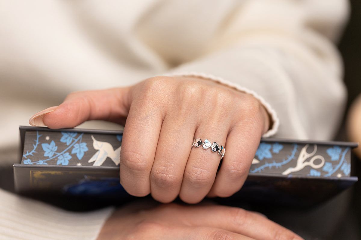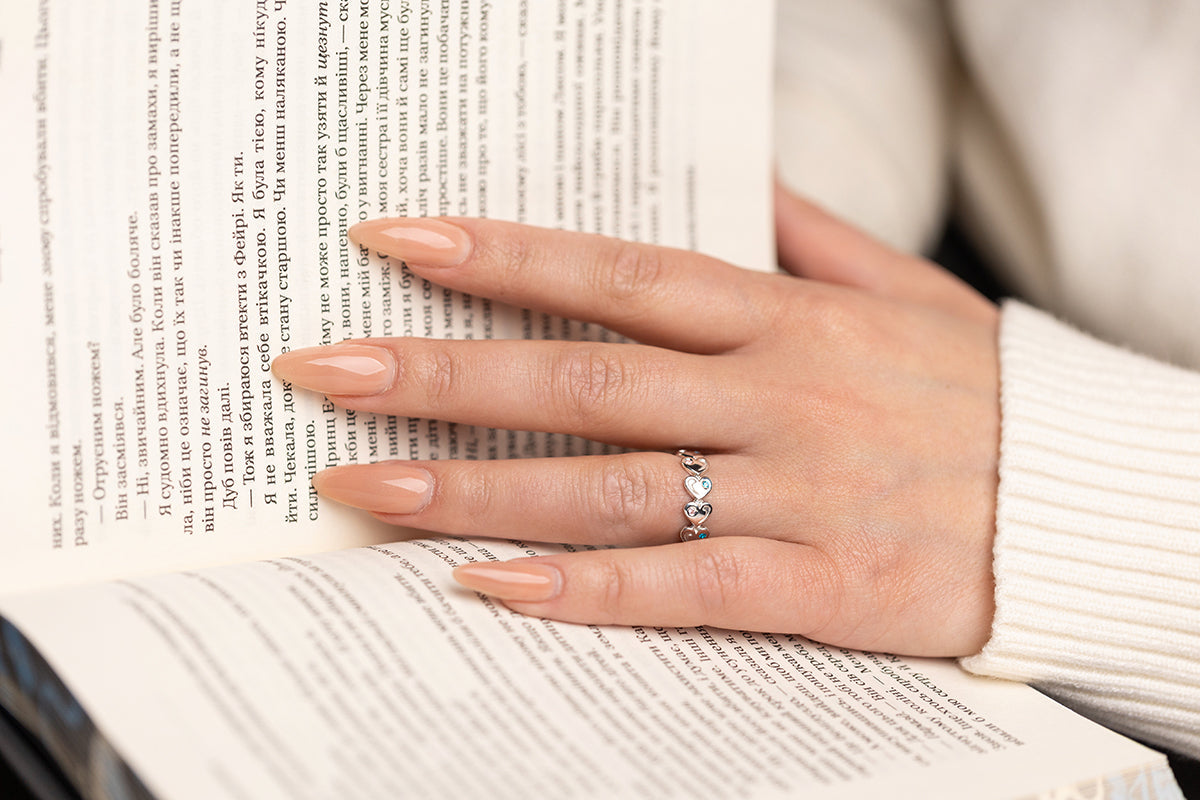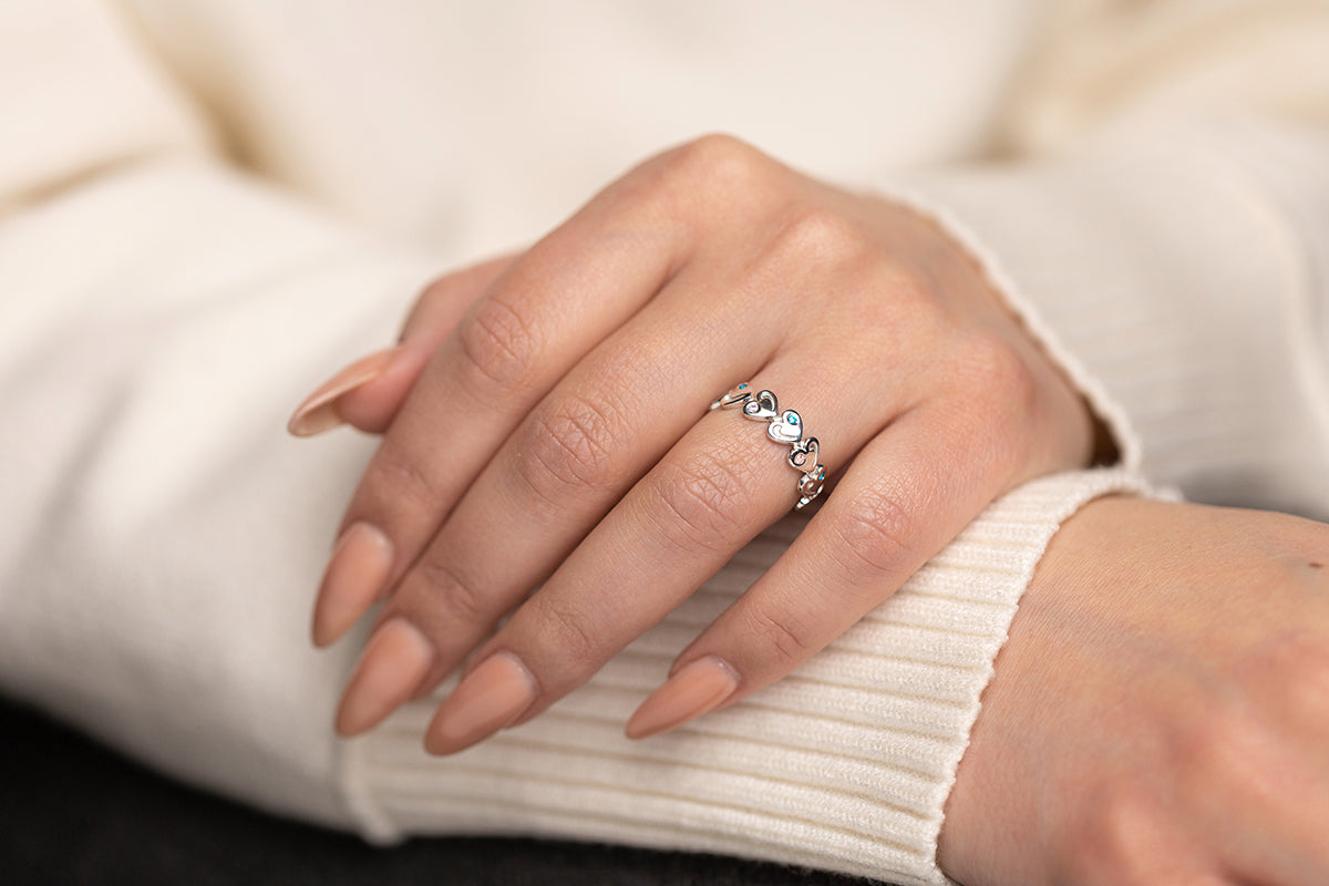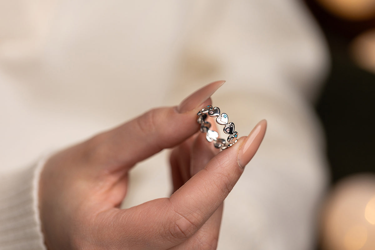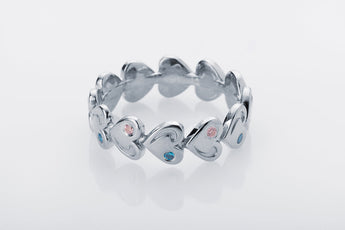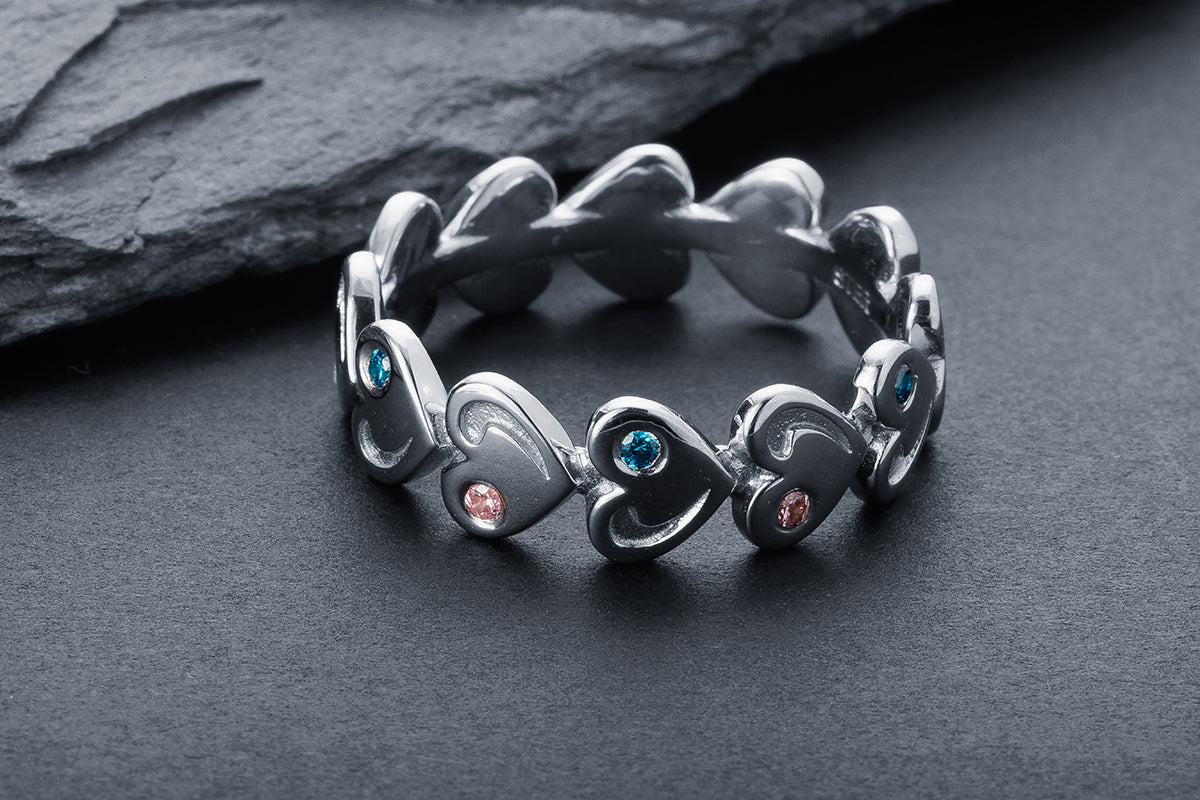 A silver ring with repeating heart-shaped elements and inlays of soft pink and blue stones. A distinctive rhythm and exquisite finish.