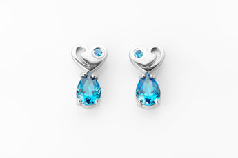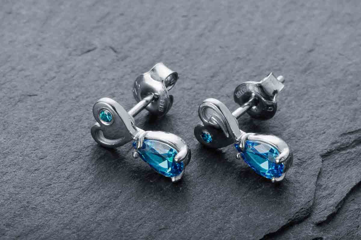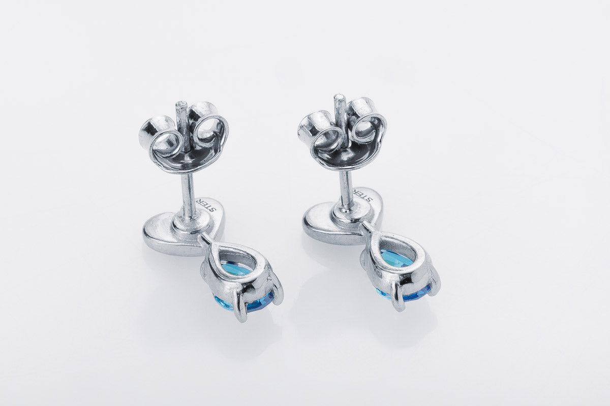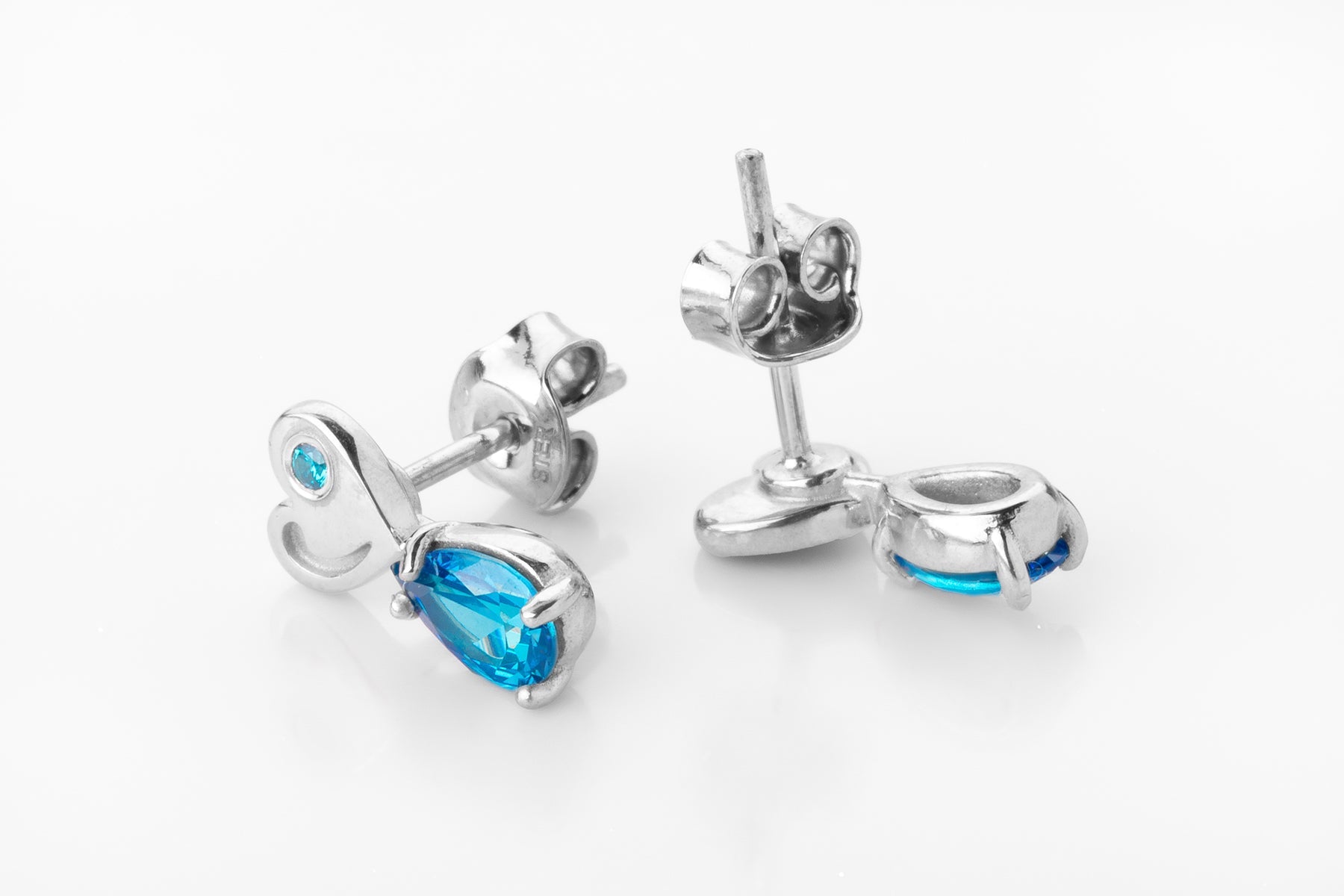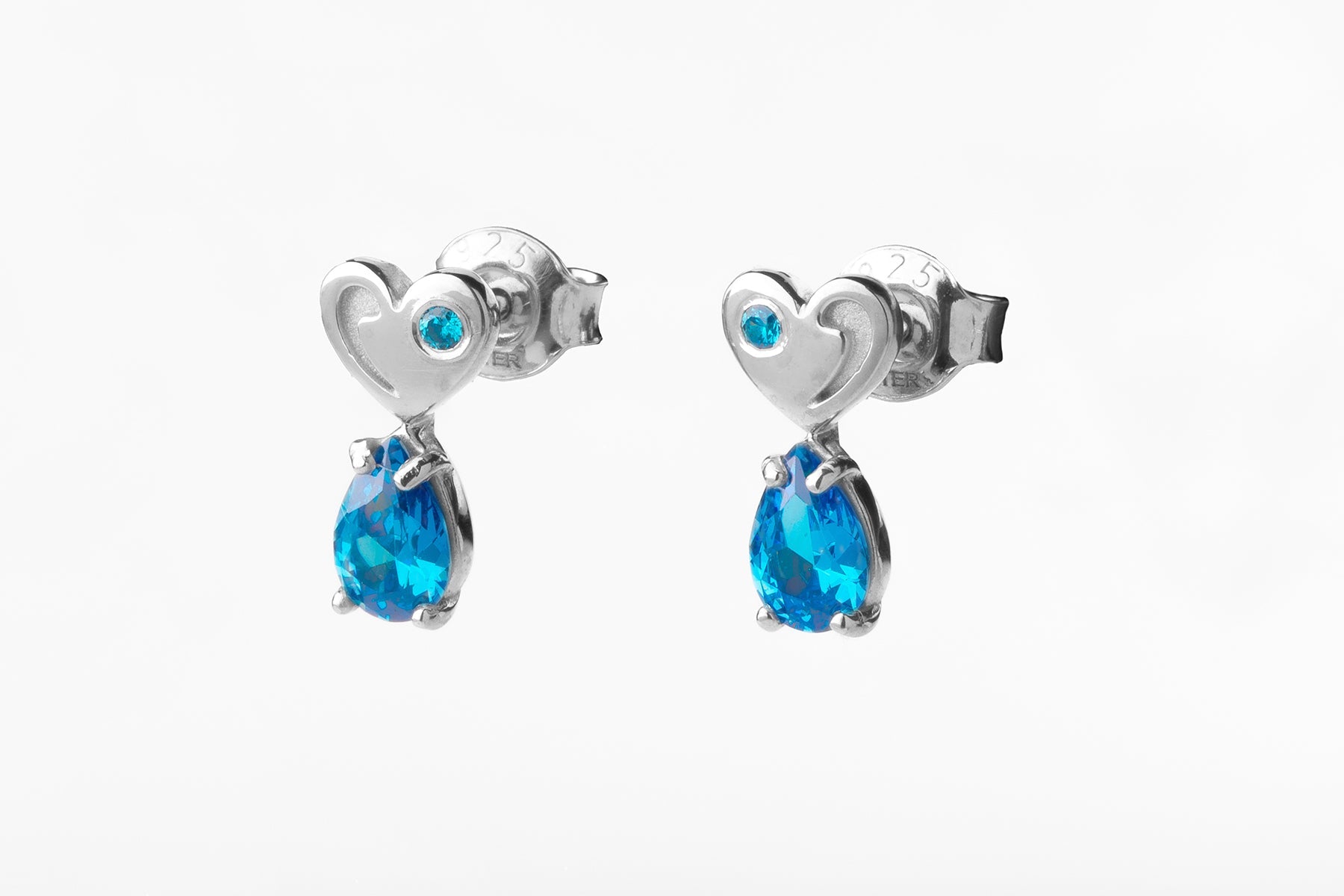 Silver stud earrings with blue stones and a heart element. Subtle sparkle with symbolic depth.