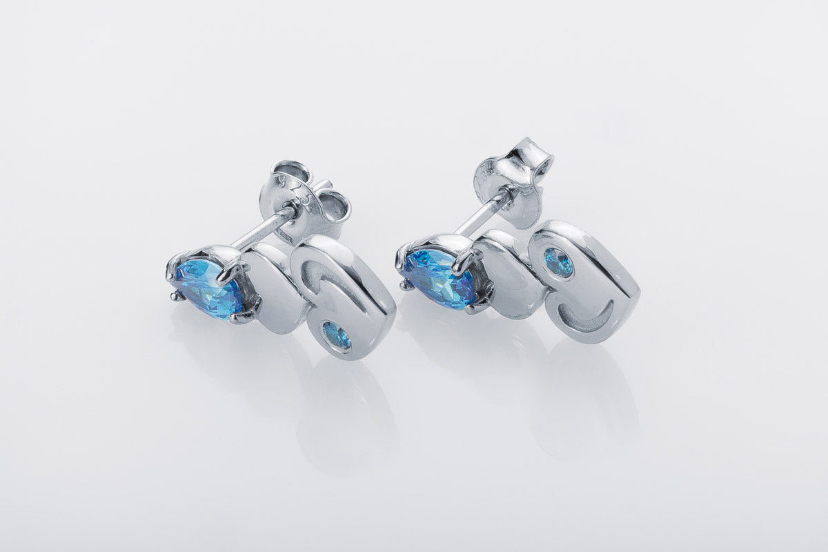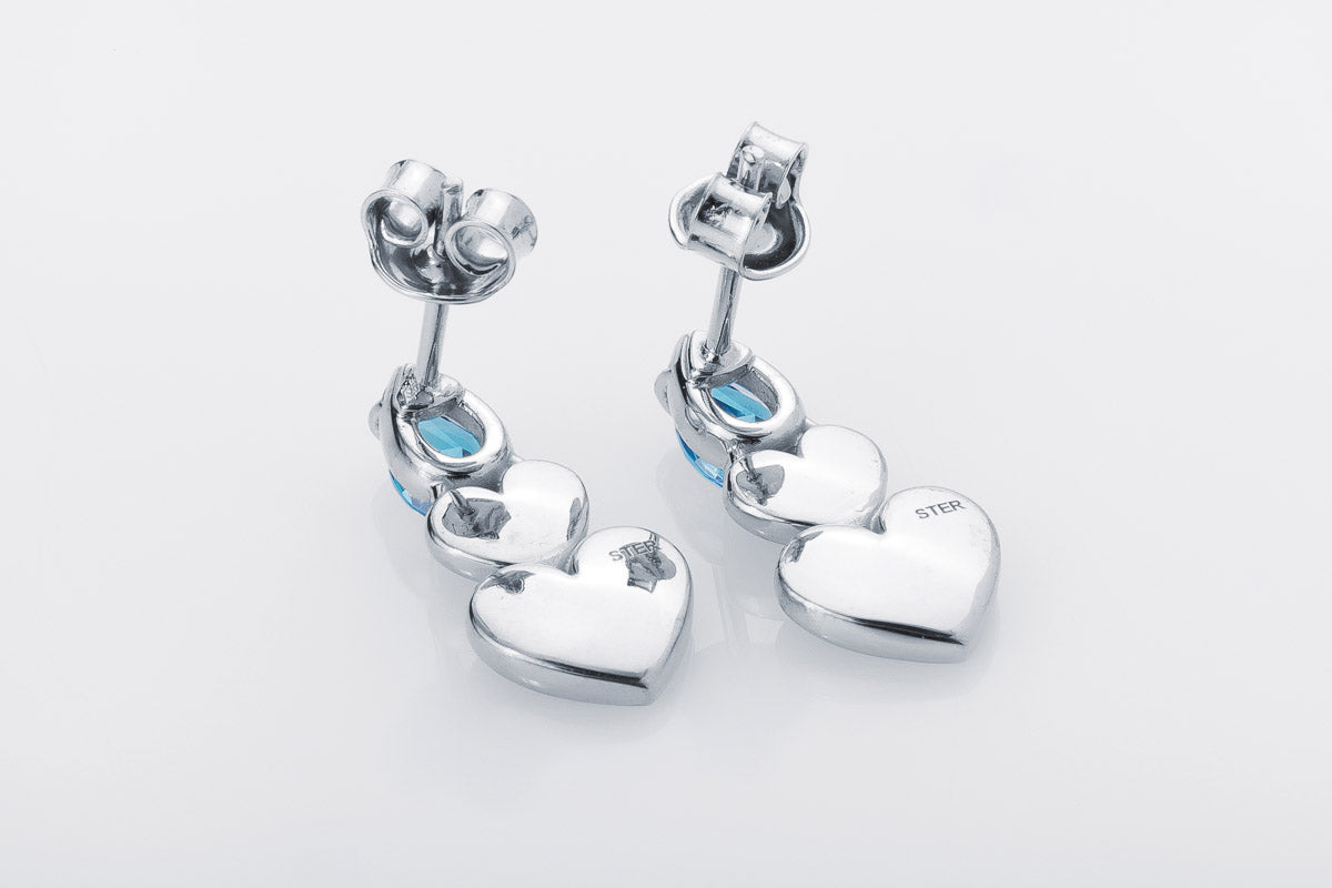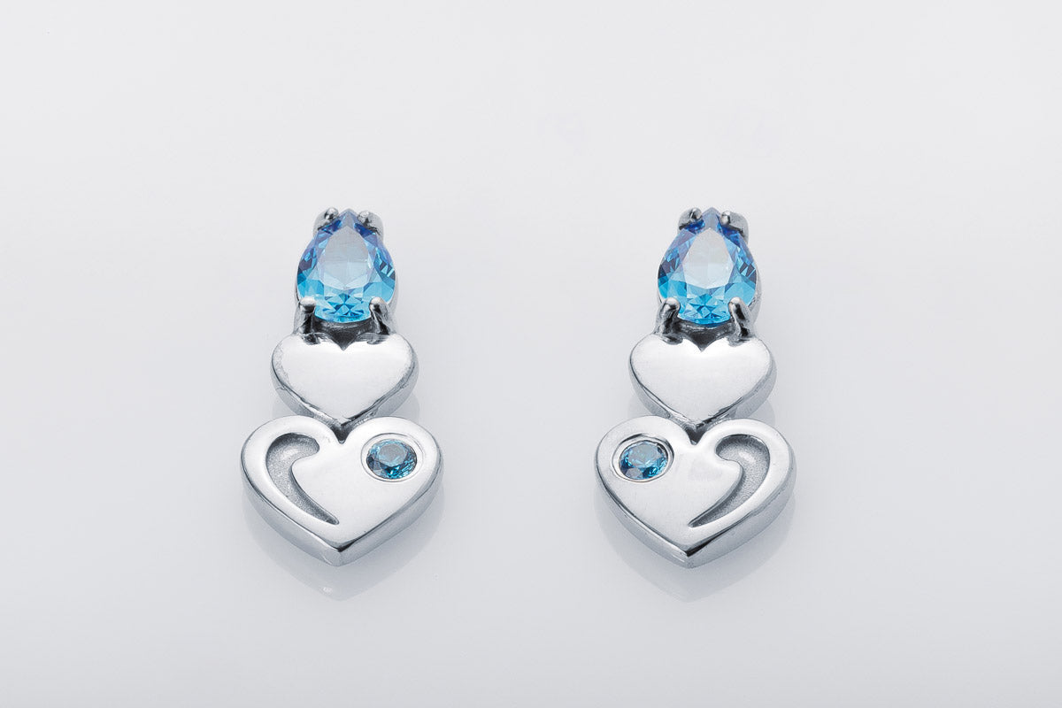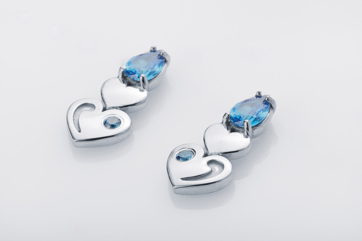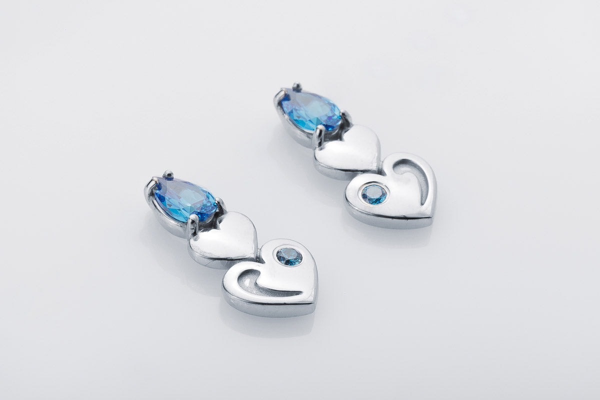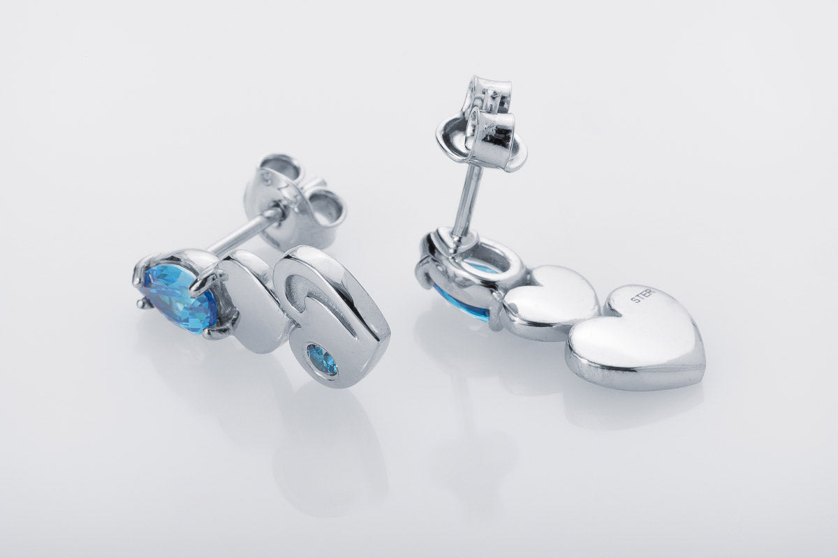 Silver stud earrings with blue stones and heart-shaped details. Elegant movement with modern charm.