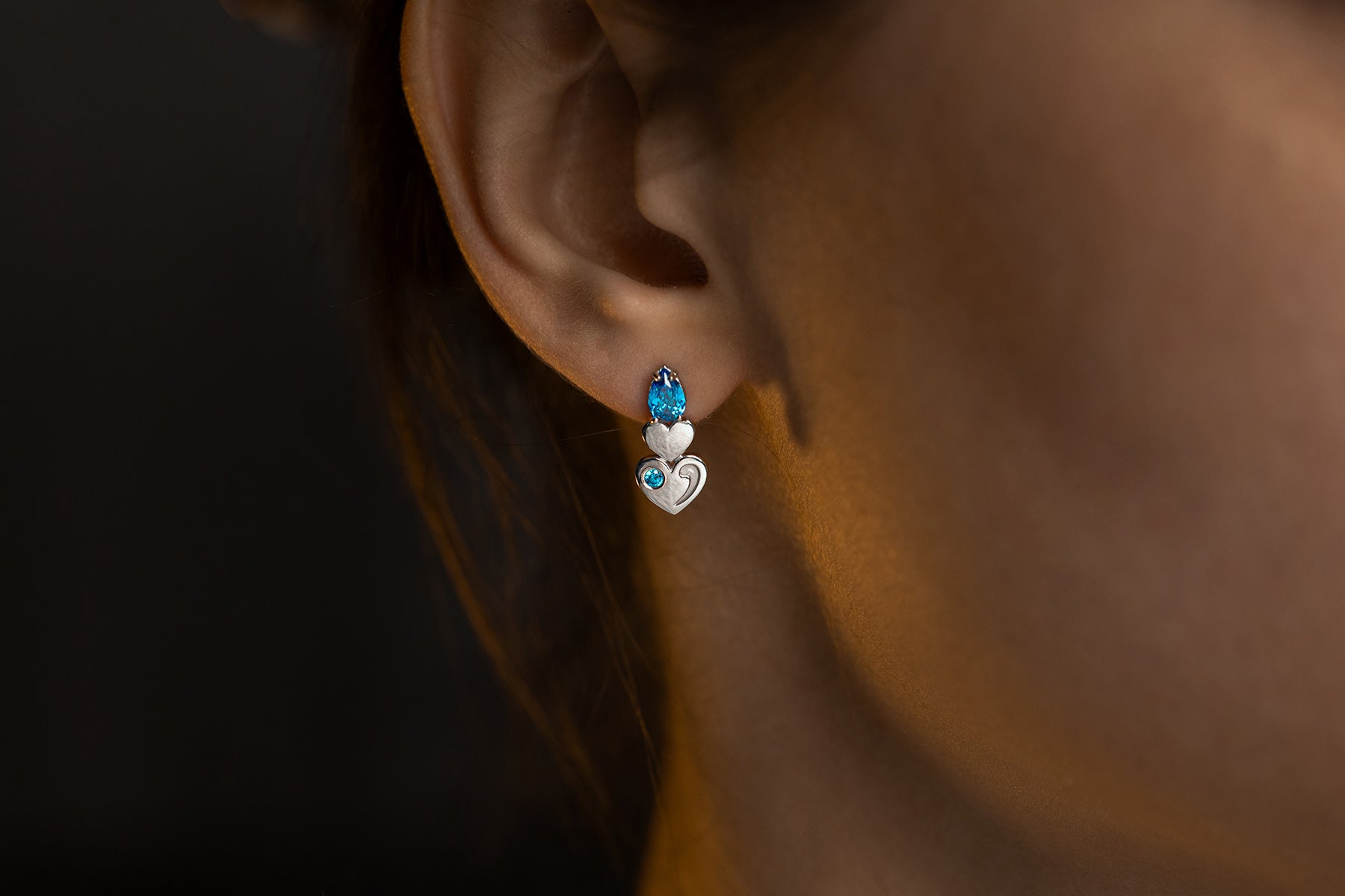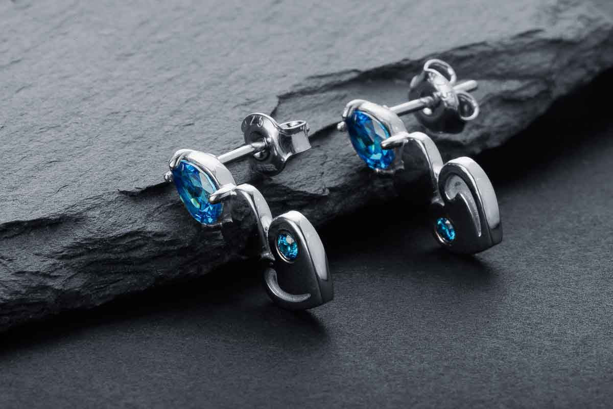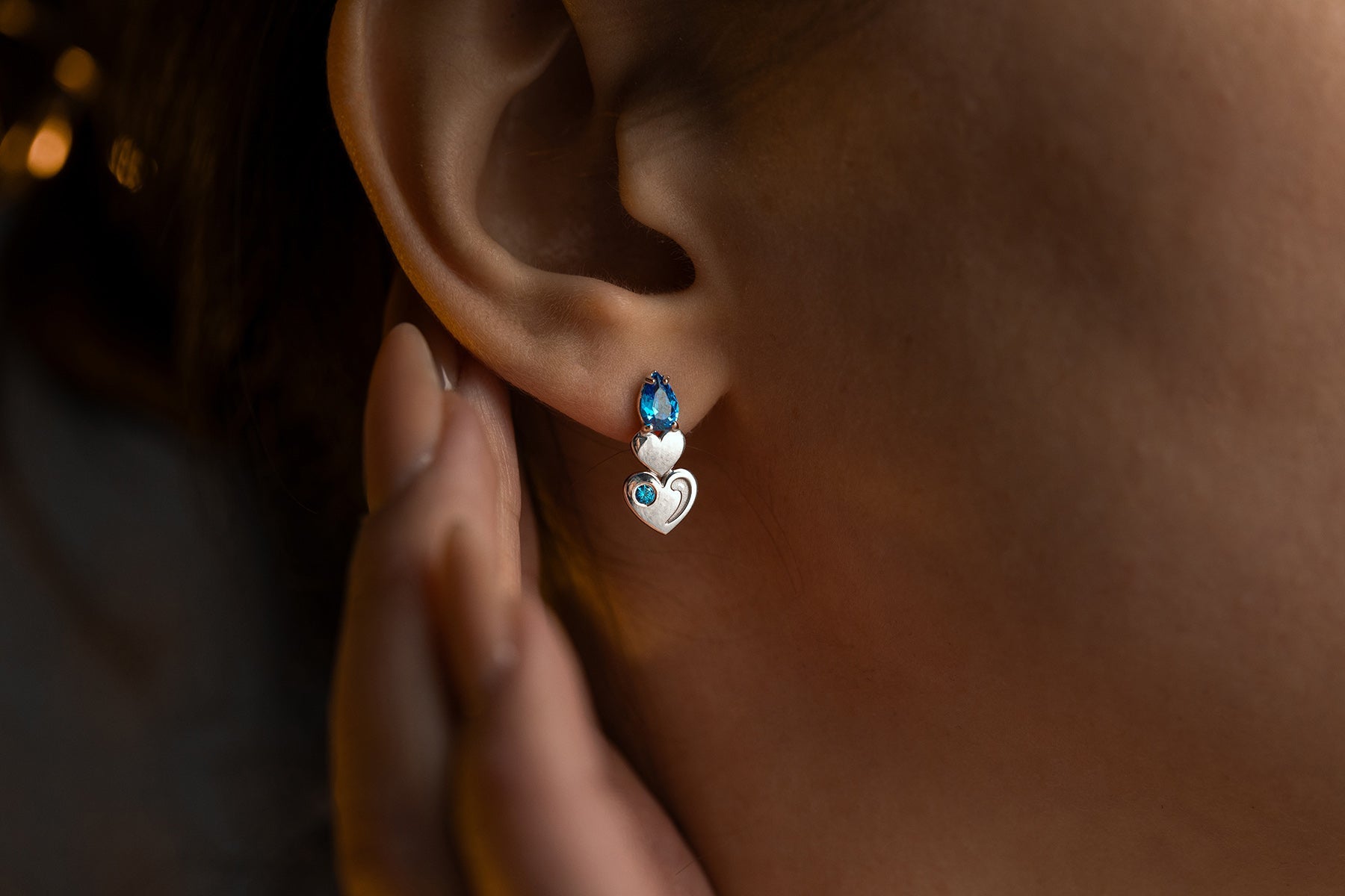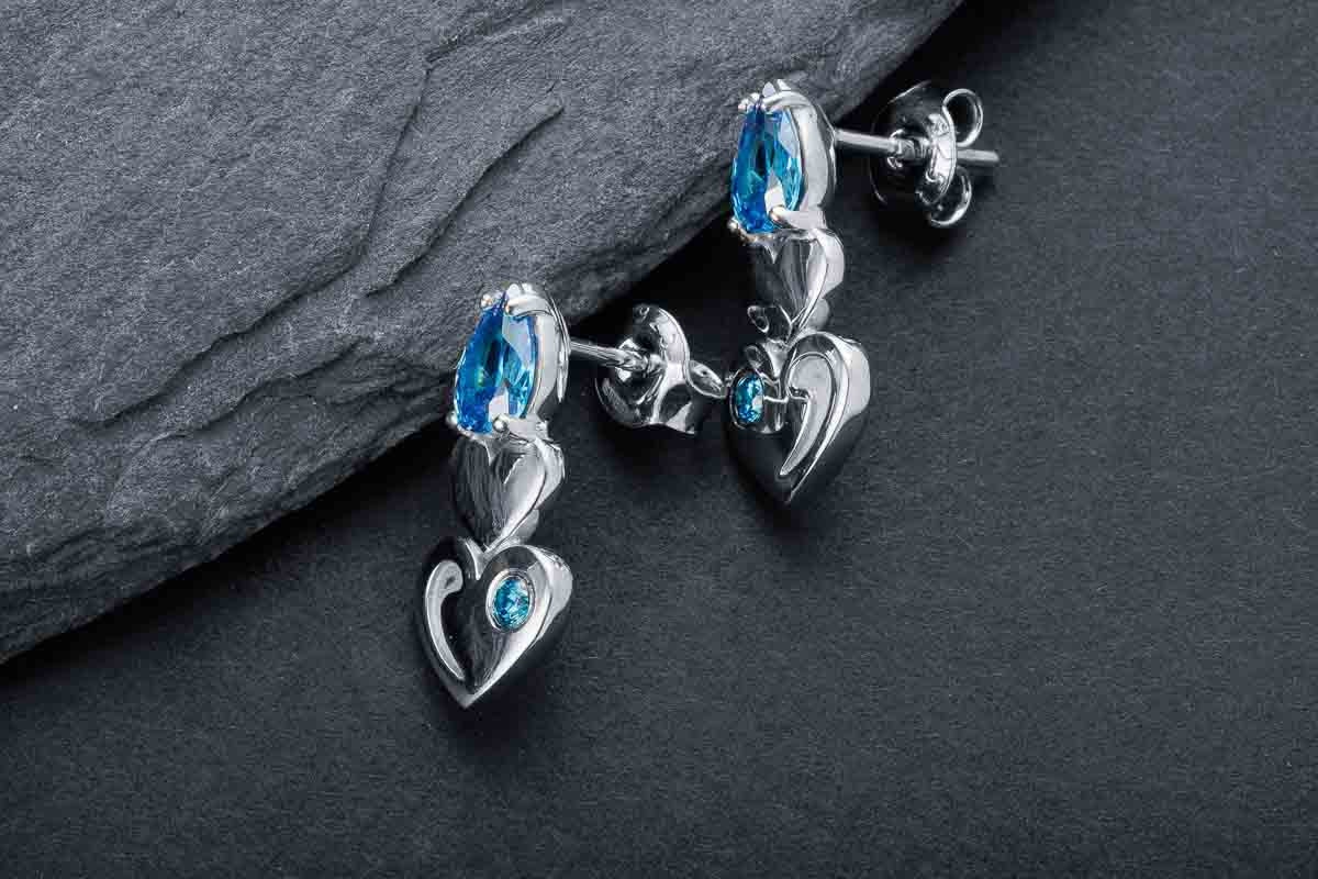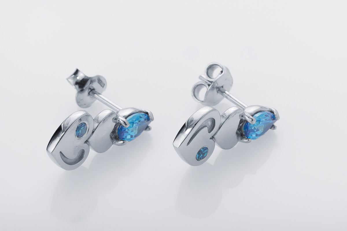 Silver stud earrings with blue stones and heart-shaped details. Elegant movement with modern charm.