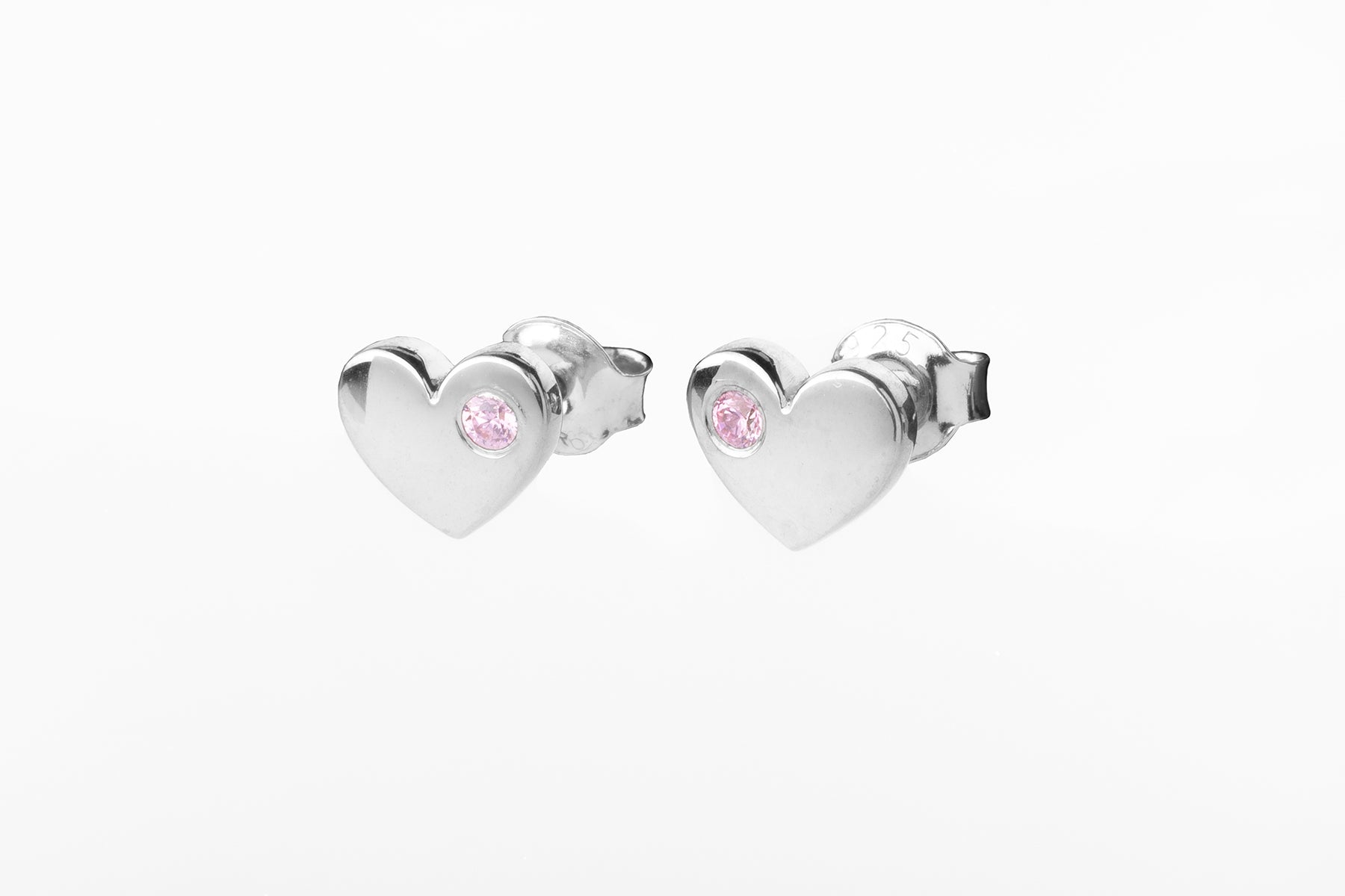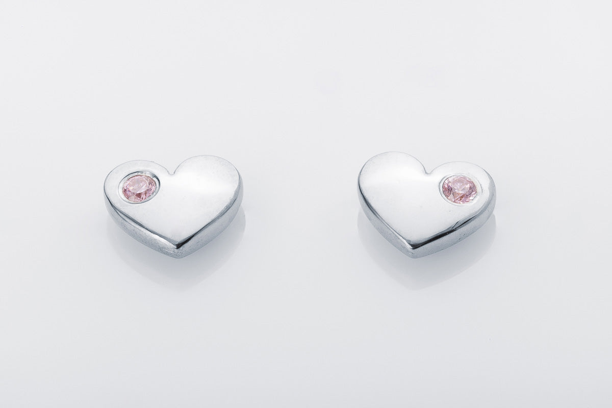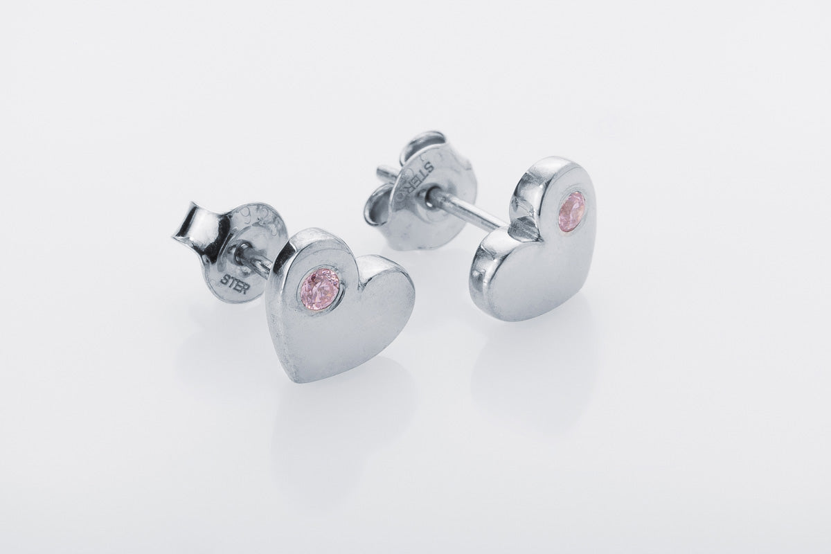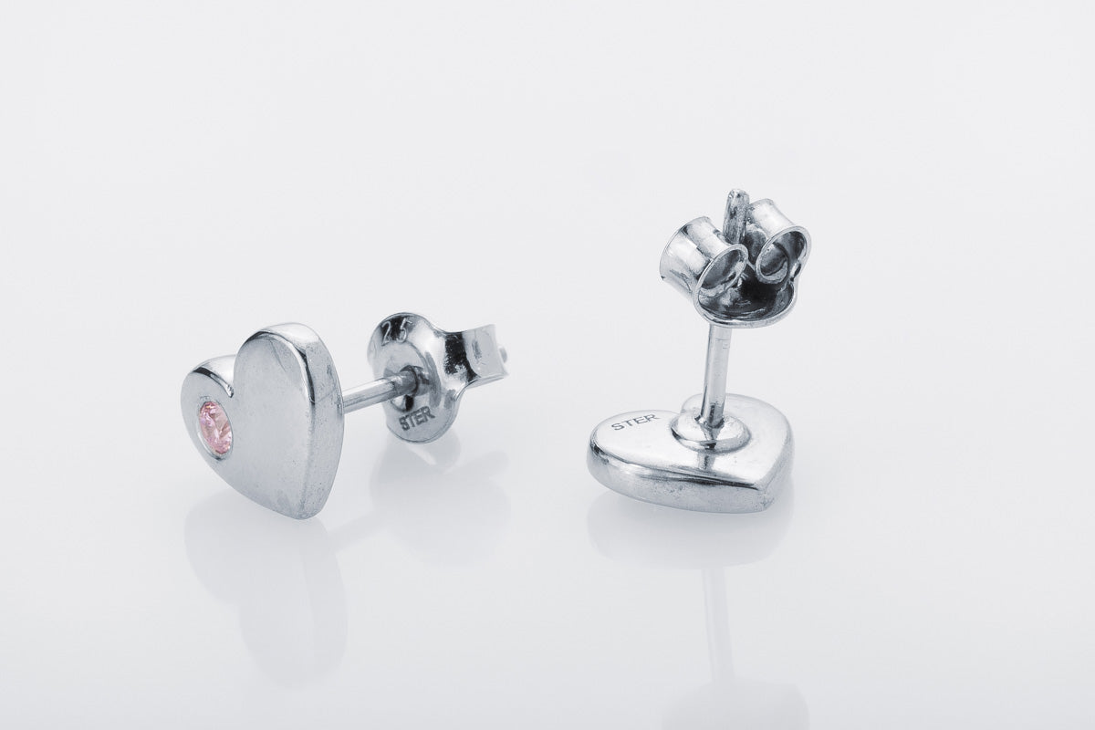 Minimal silver heart stud earrings with a soft accent. Timeless simplicity and refined elegance.