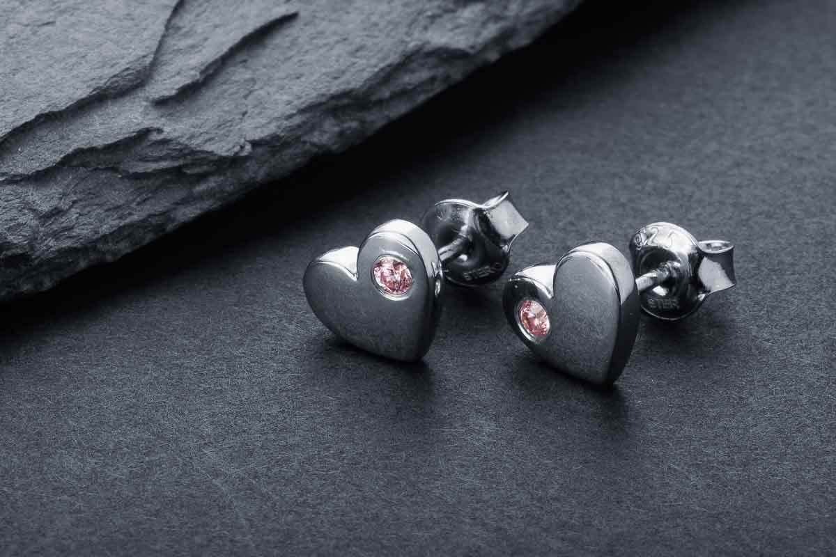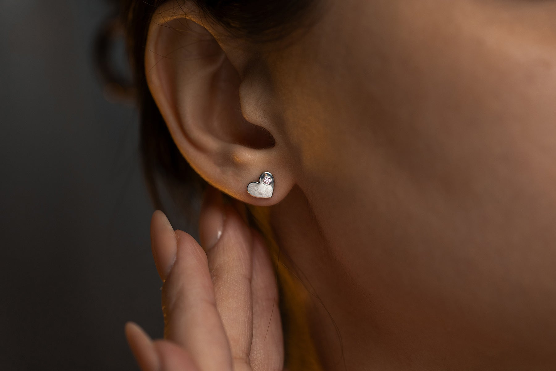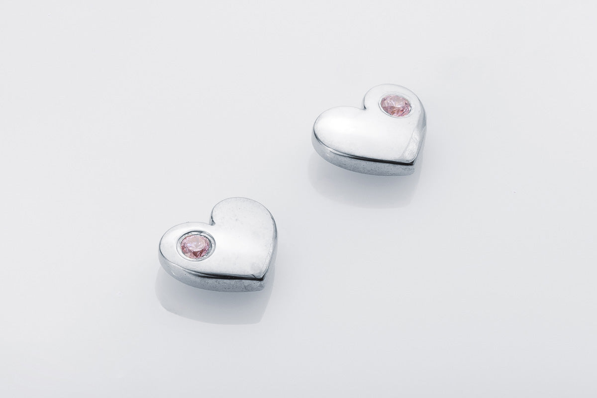 Minimal silver heart stud earrings with a soft accent. Timeless simplicity and refined elegance.