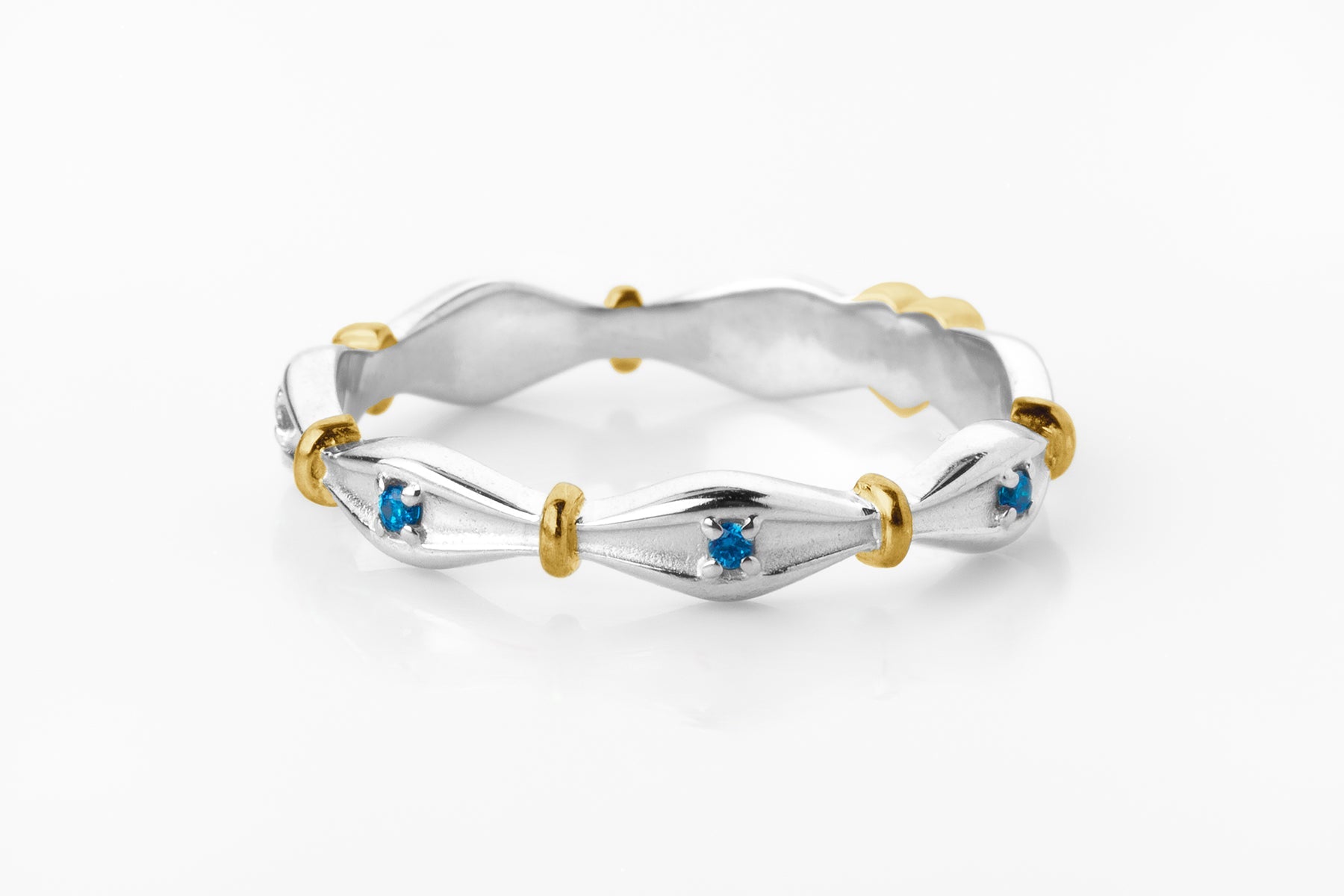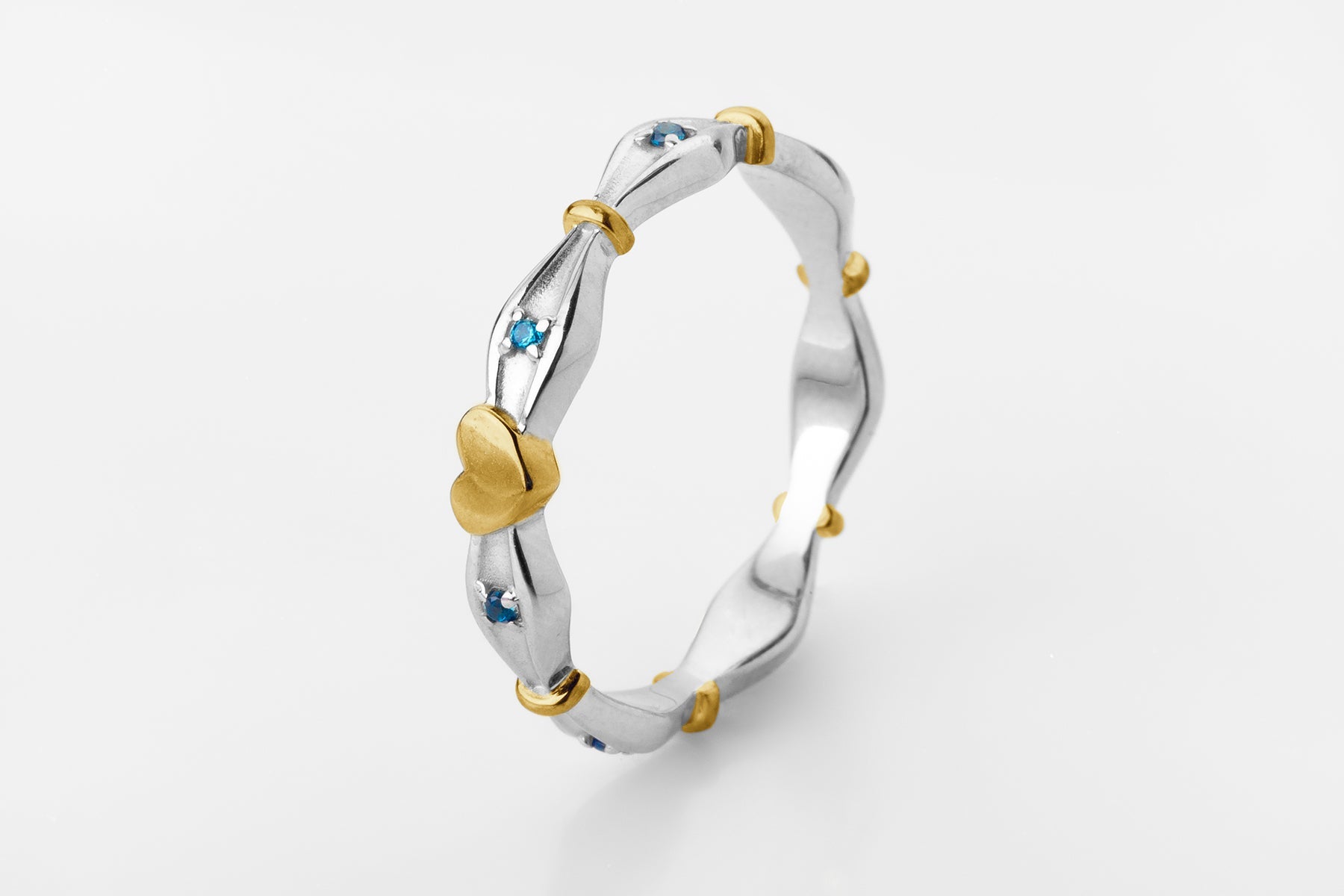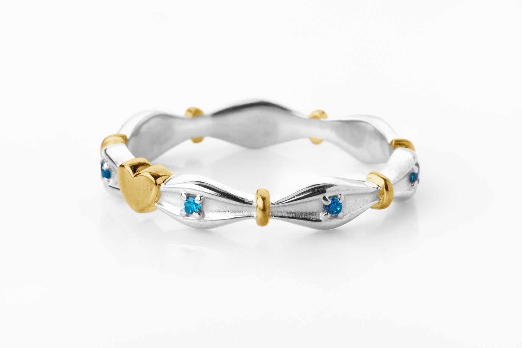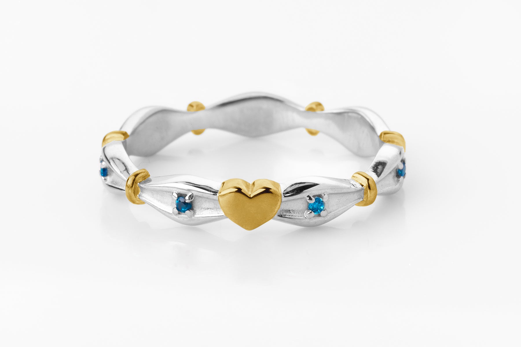 Silver ring with sculptural lines, blue stones, and a gold heart detail. Expressive form with timeless appeal.