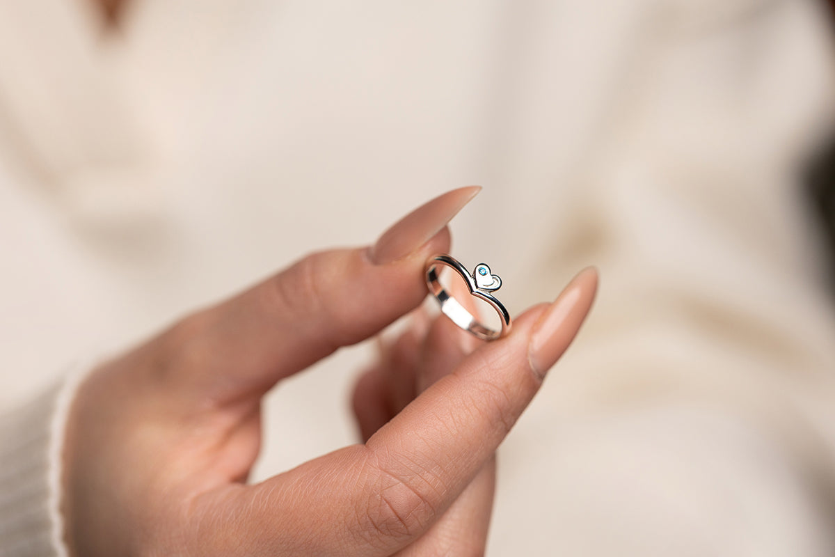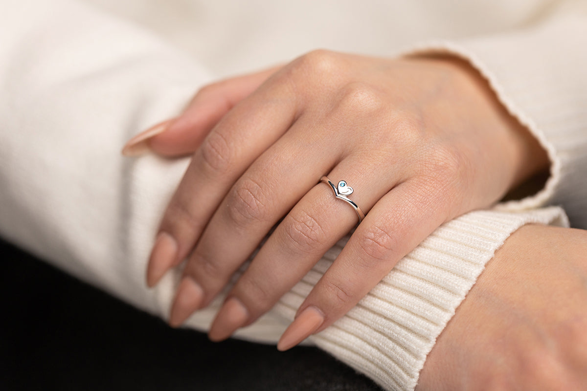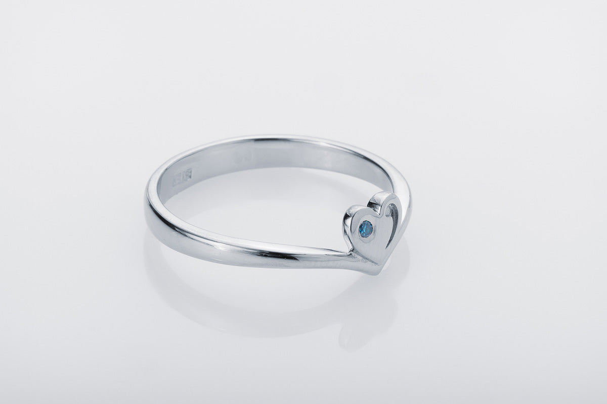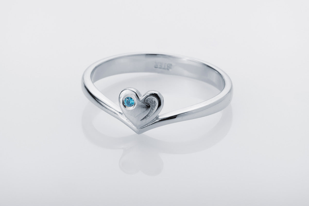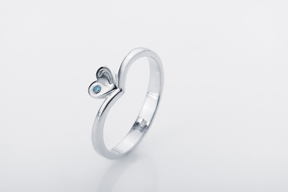 Slim silver ring with a heart motif and a blue stone accent. Refined form designed for everyday luxury.