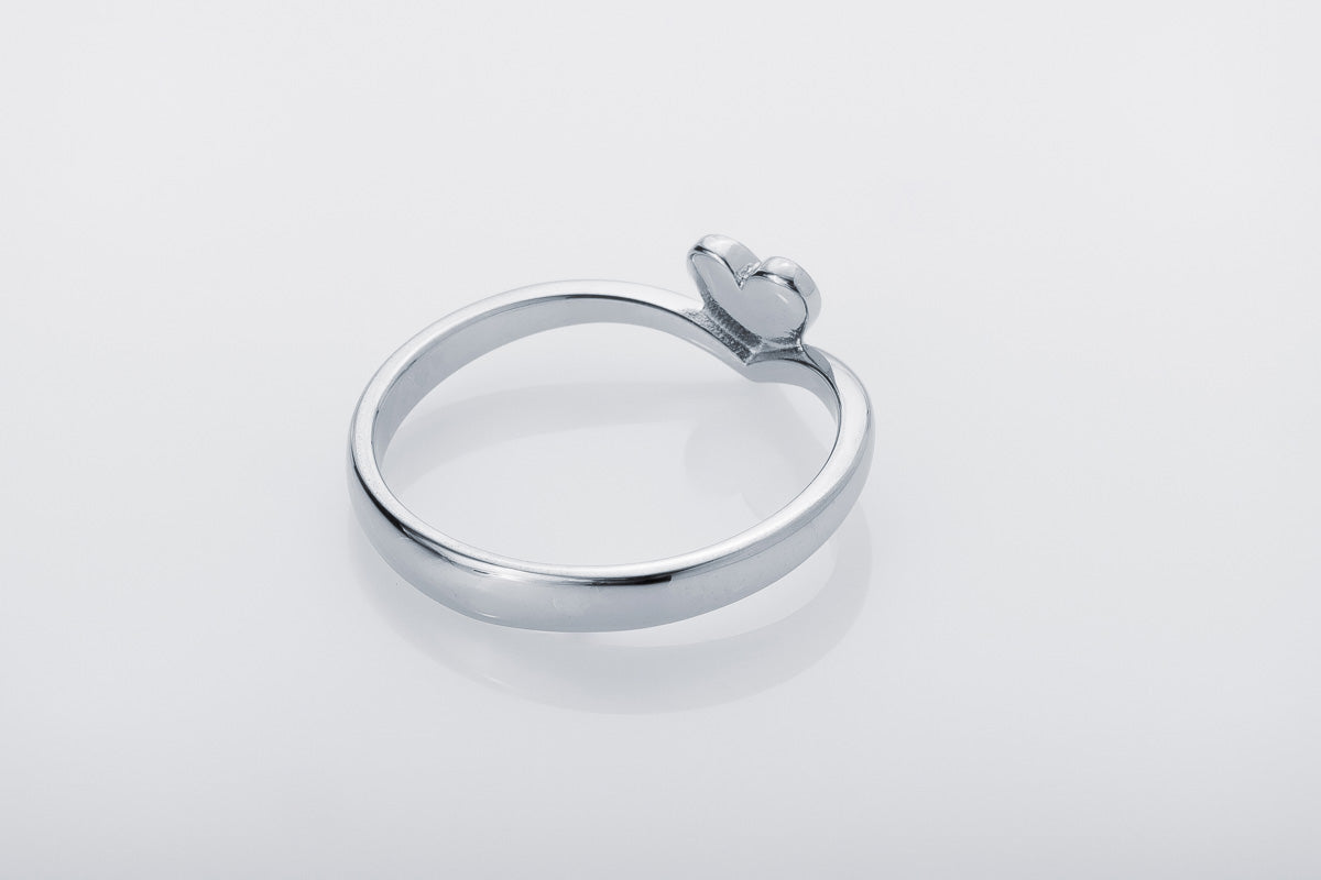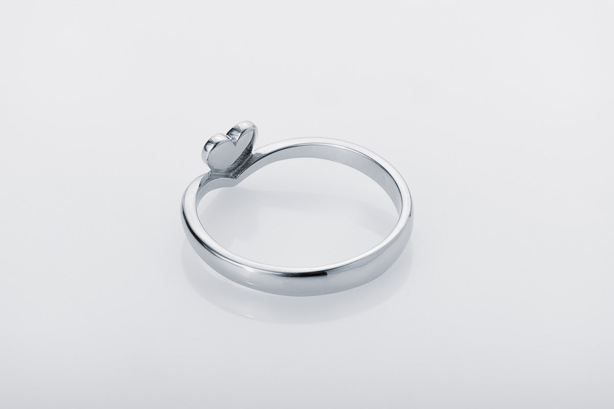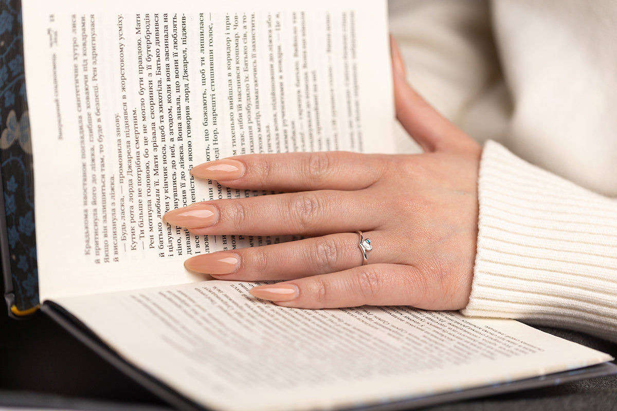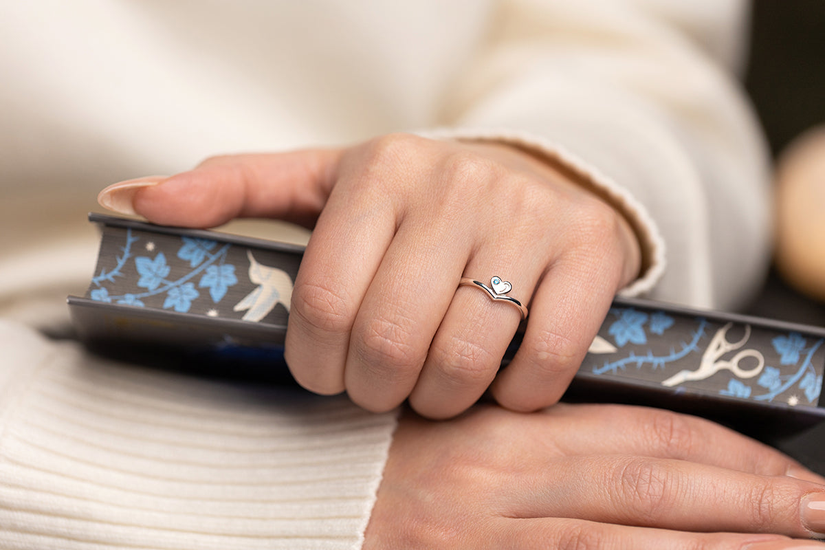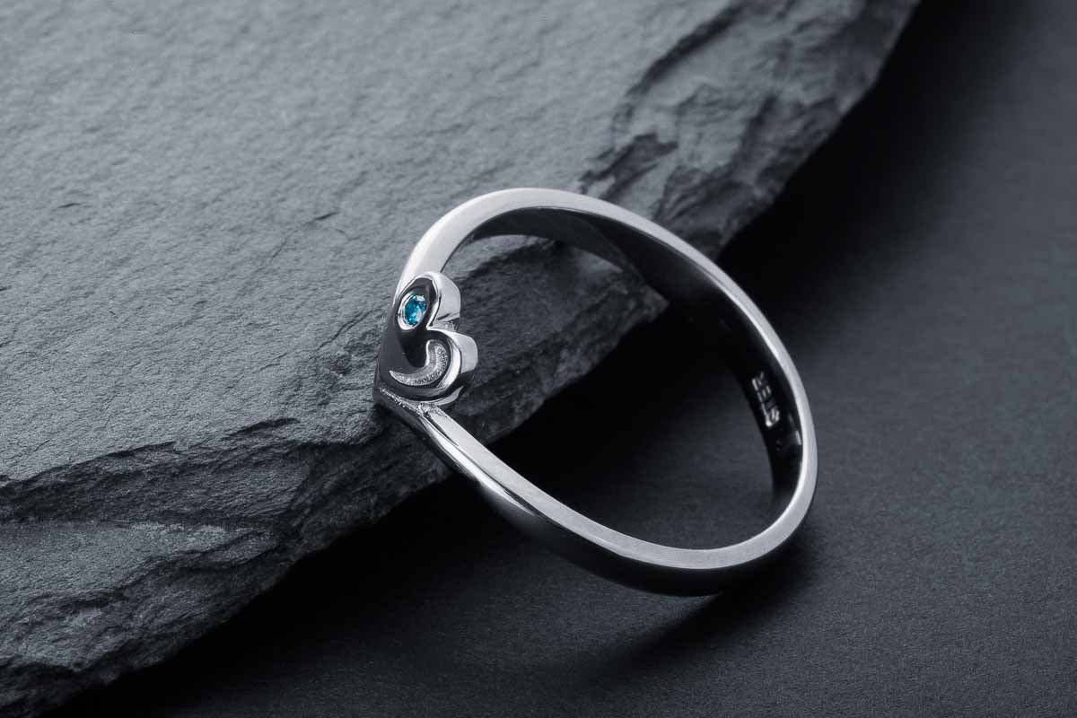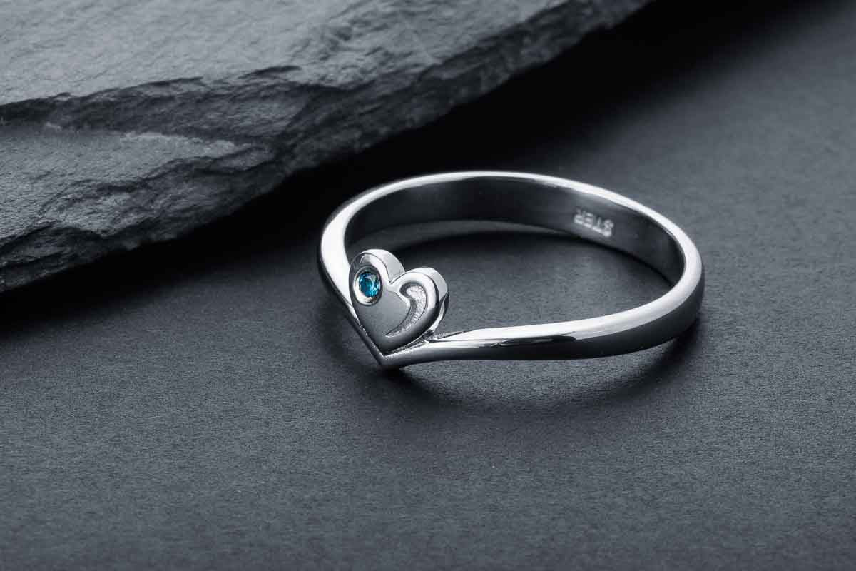 Slim silver ring with a heart motif and a blue stone accent. Refined form designed for everyday luxury.