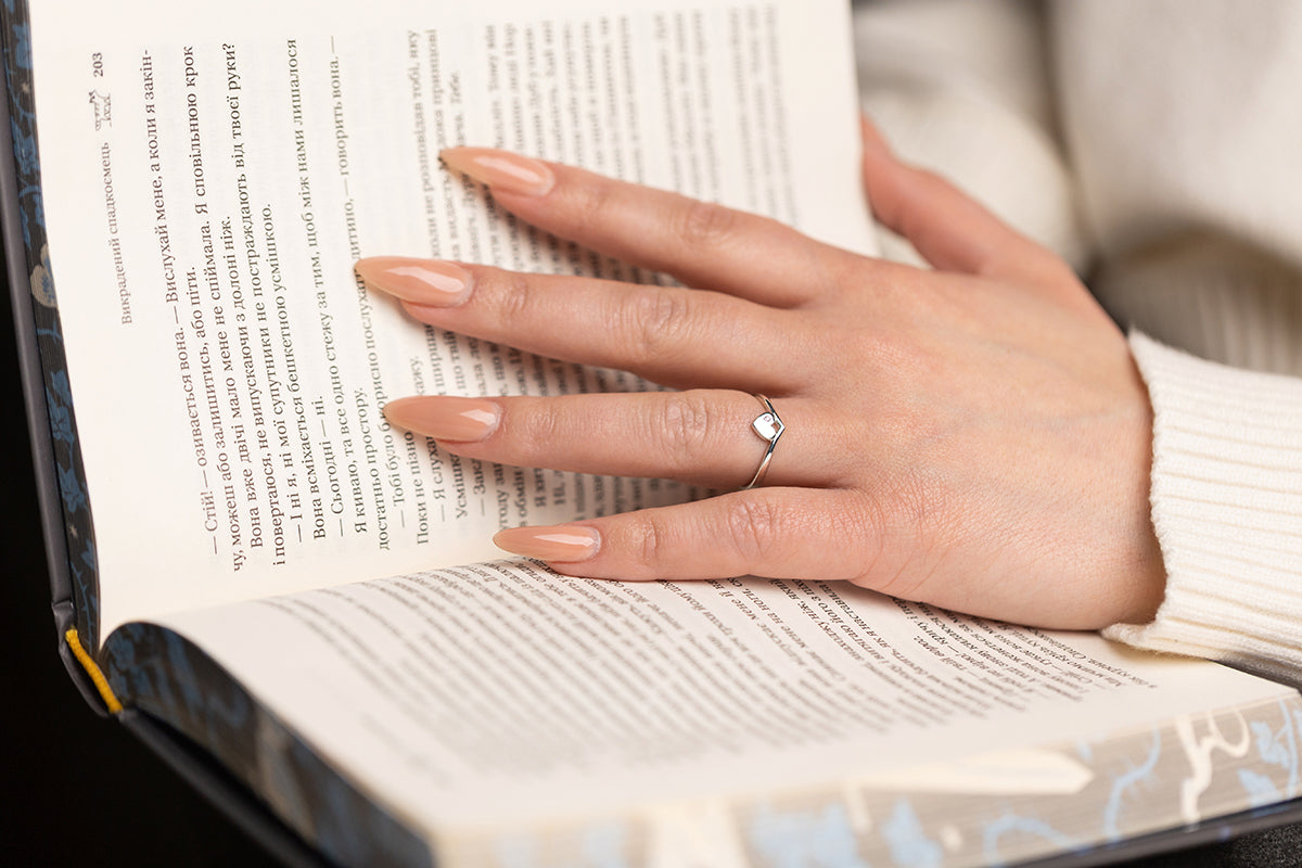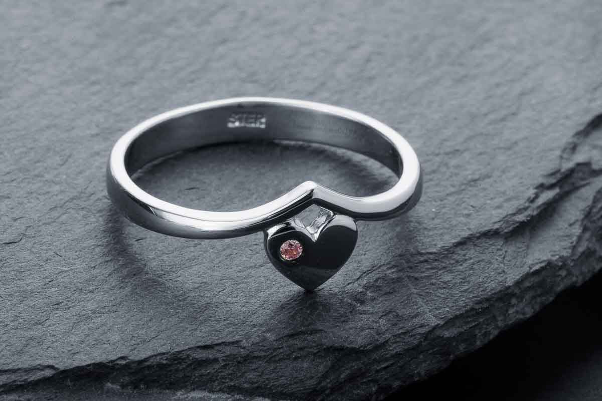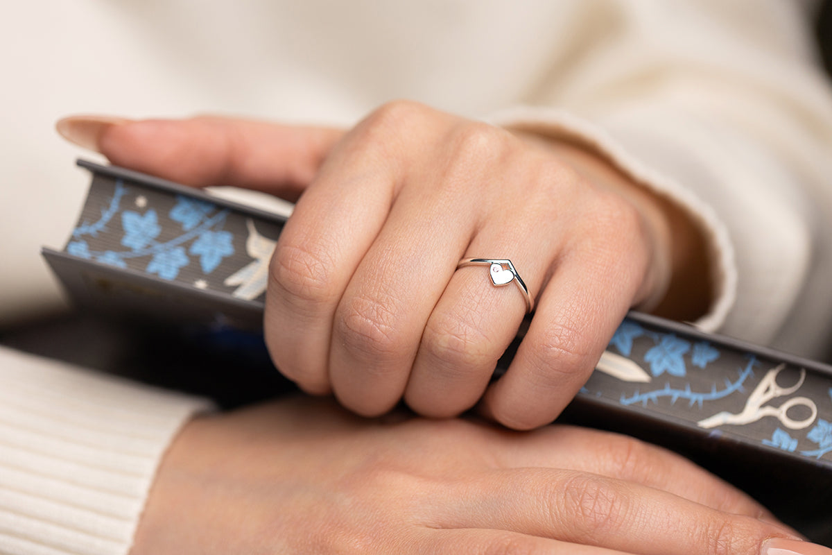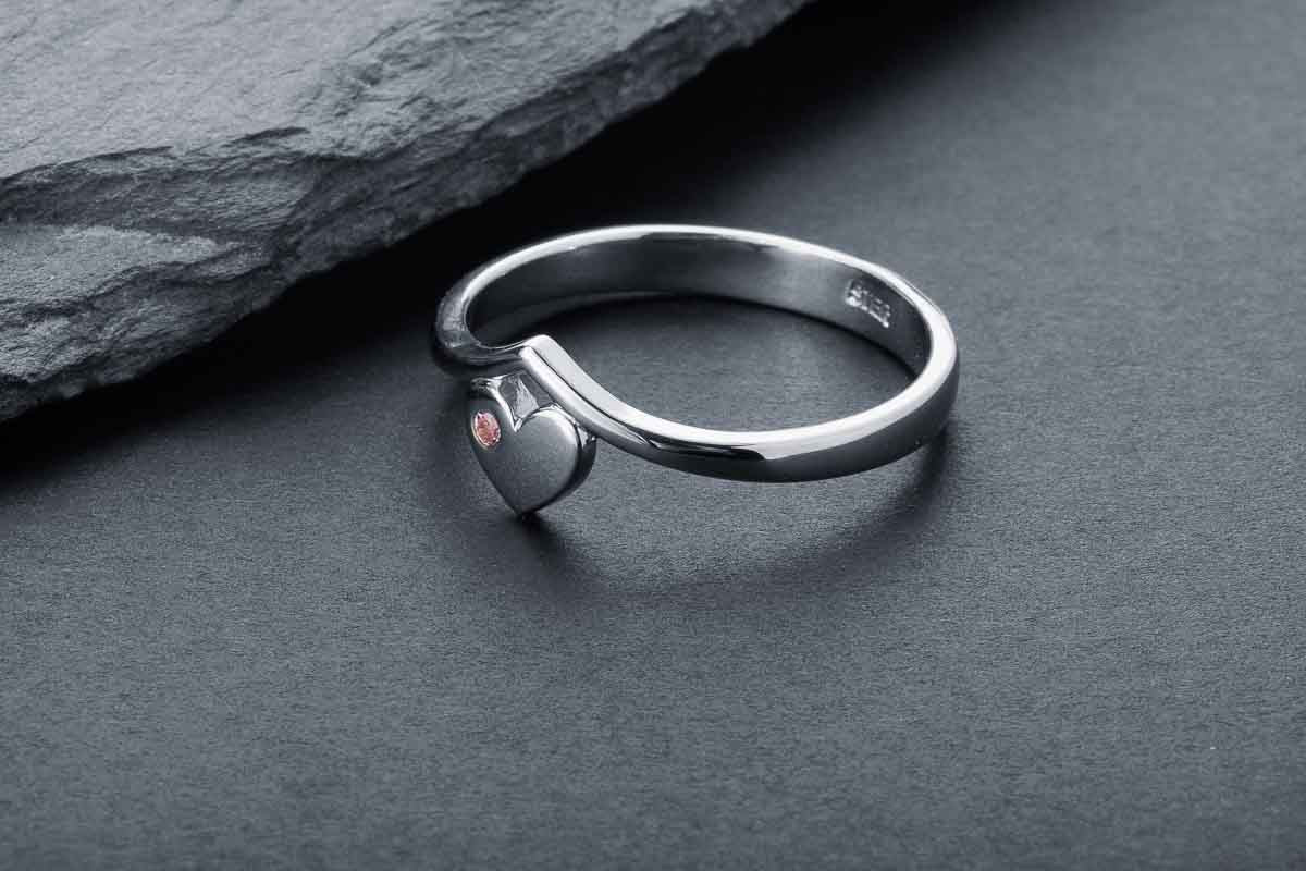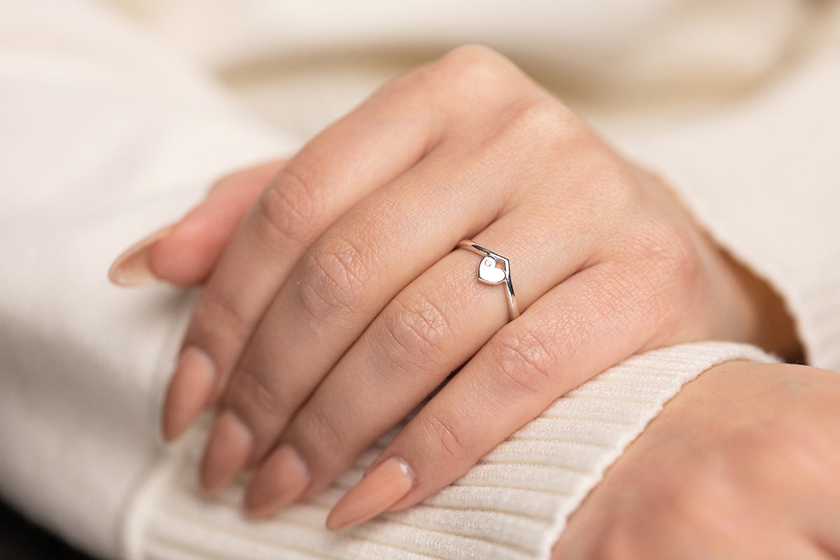 Minimal silver ring with a heart detail and soft accent. Clean lines with quiet emotion.