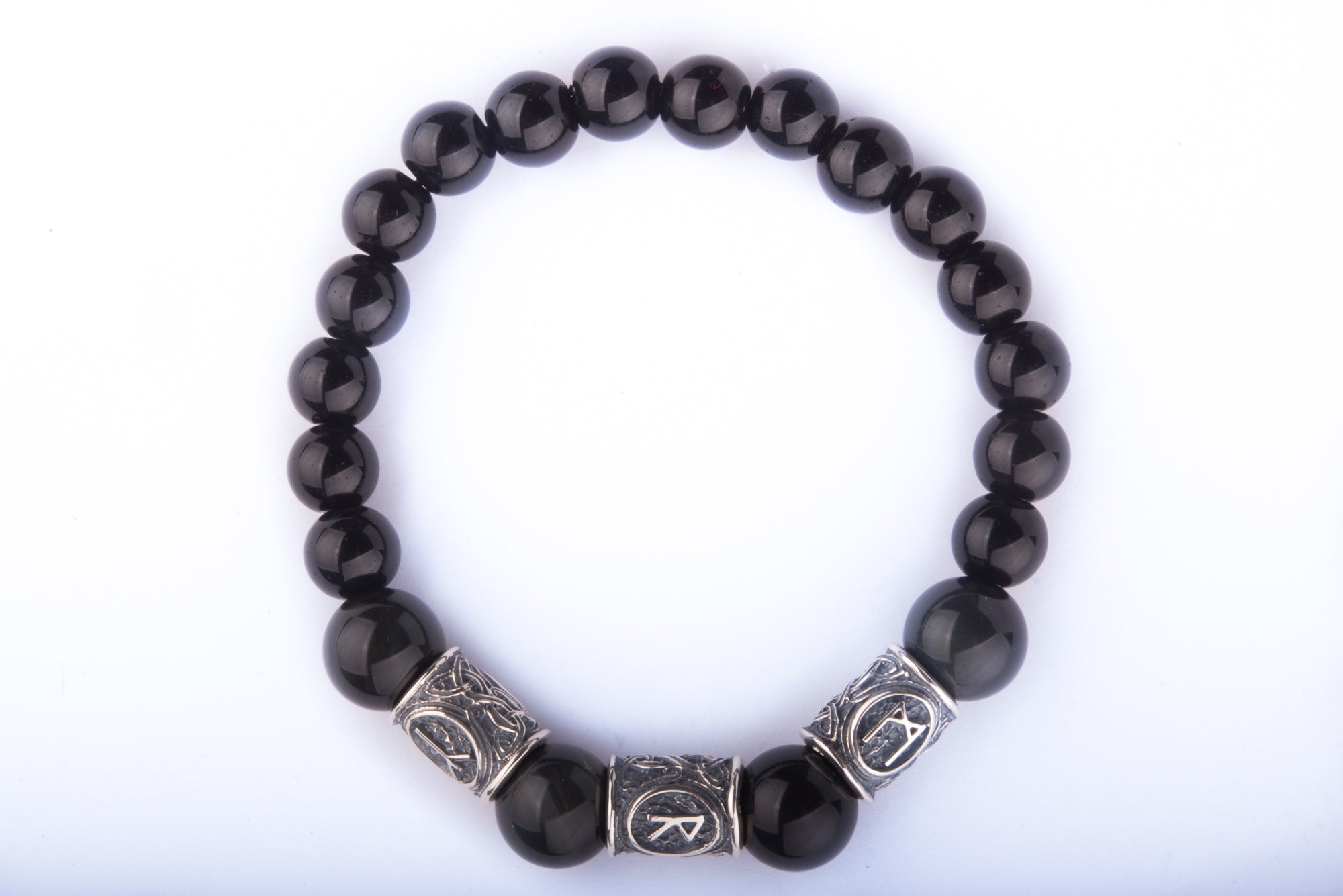 This bracelet combines black agate and black obsidian beads. Black agate is valued for its deep, uniform color and is traditionally considered a protective stone that fosters strength and emotional stability. Black obsidian is known for its grounding properties and its ability to shield against negative energy.