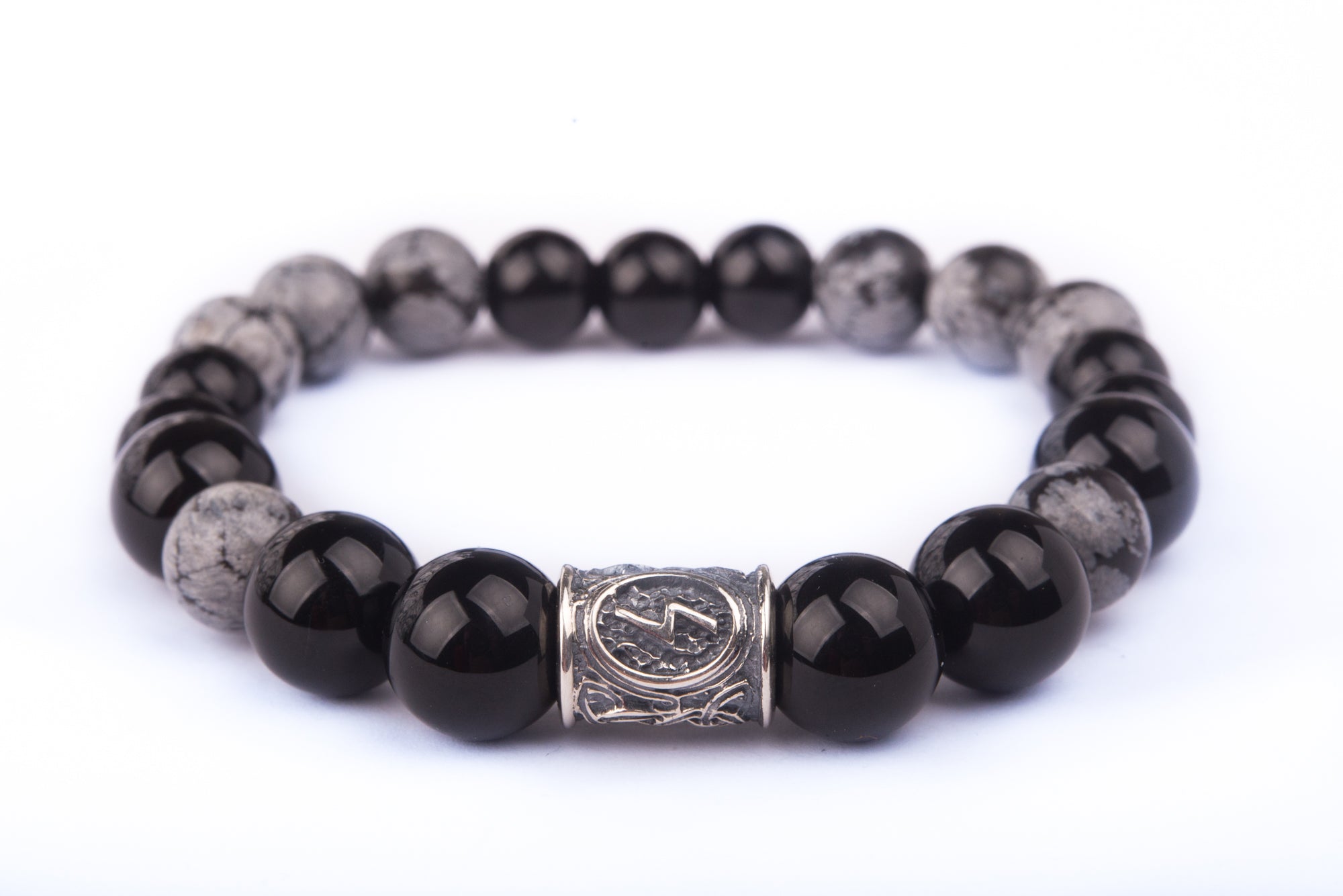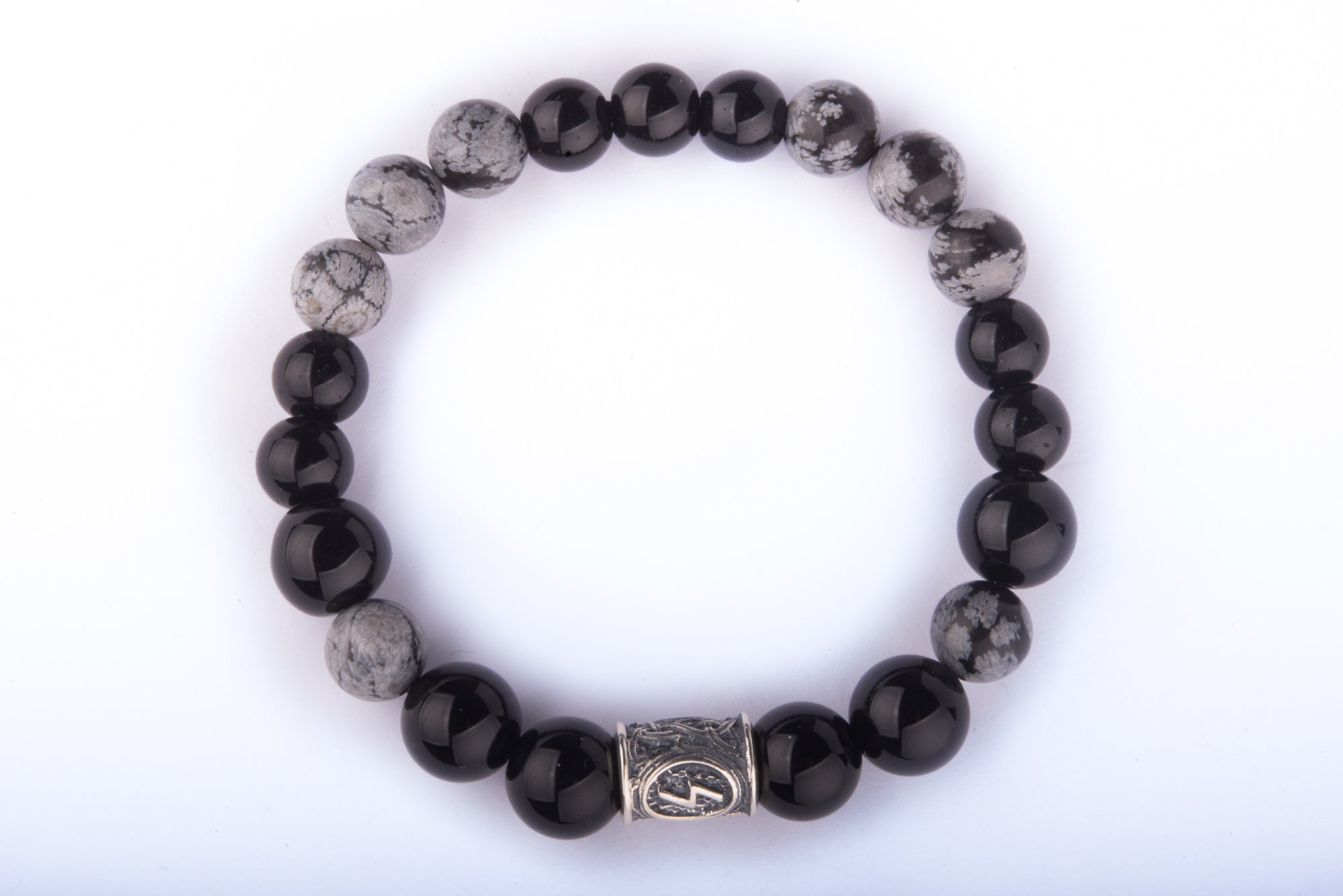 The combination of black agate, snowflake obsidian, and silver detailing creates a restrained yet distinctive accessory with character.