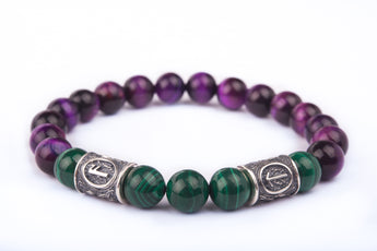 This bracelet combines malachite and Cat’s Eye beads. Malachite, with its deep green patterns, is traditionally valued for protection, emotional balance, and inner strength. Cat’s Eye, known for its distinctive reflective effect, is associated with focus, awareness, and heightened intuition.