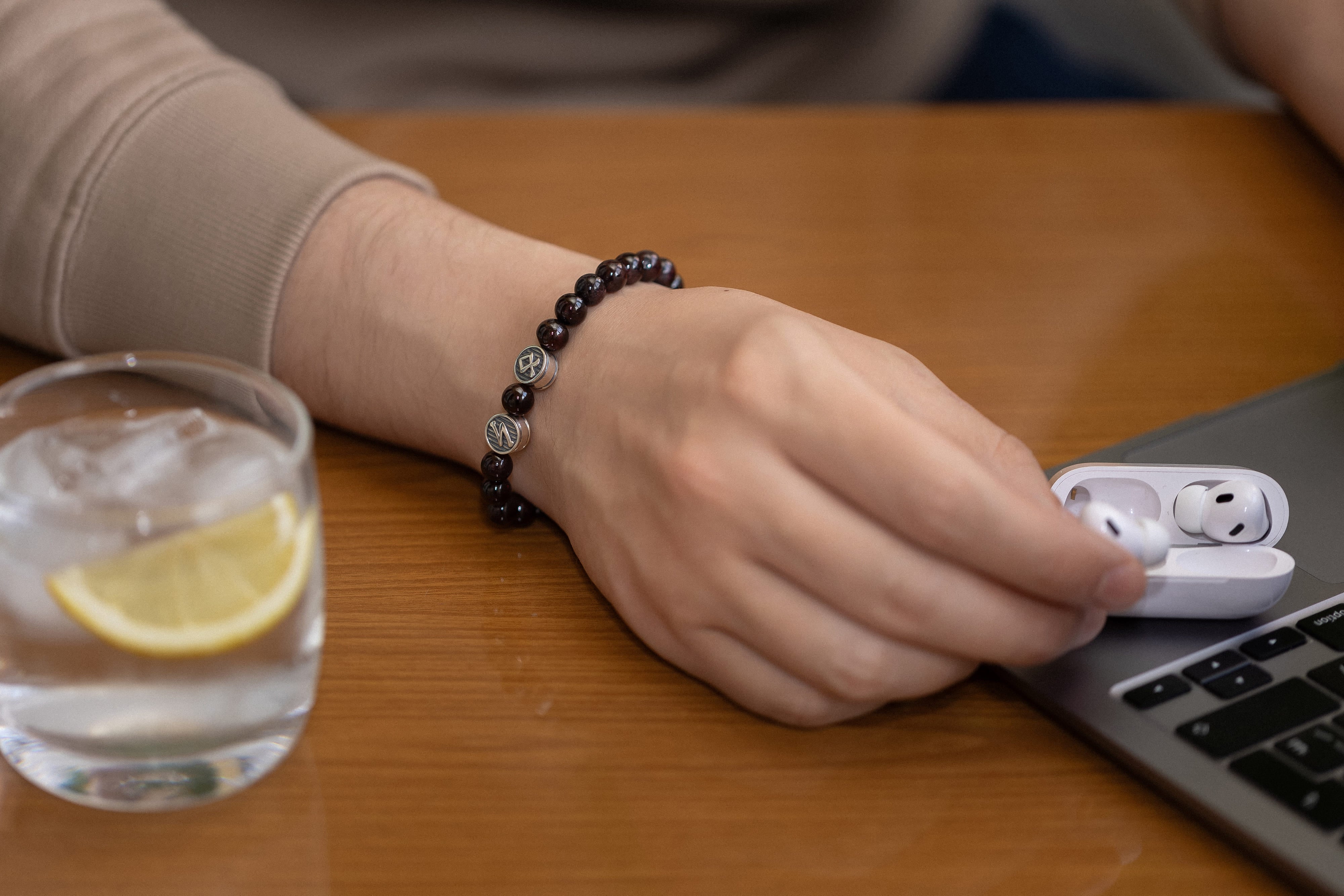 This bracelet is made from natural garnet beads, valued for their deep red color and traditionally associated with strength, vitality, and protection.