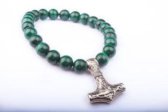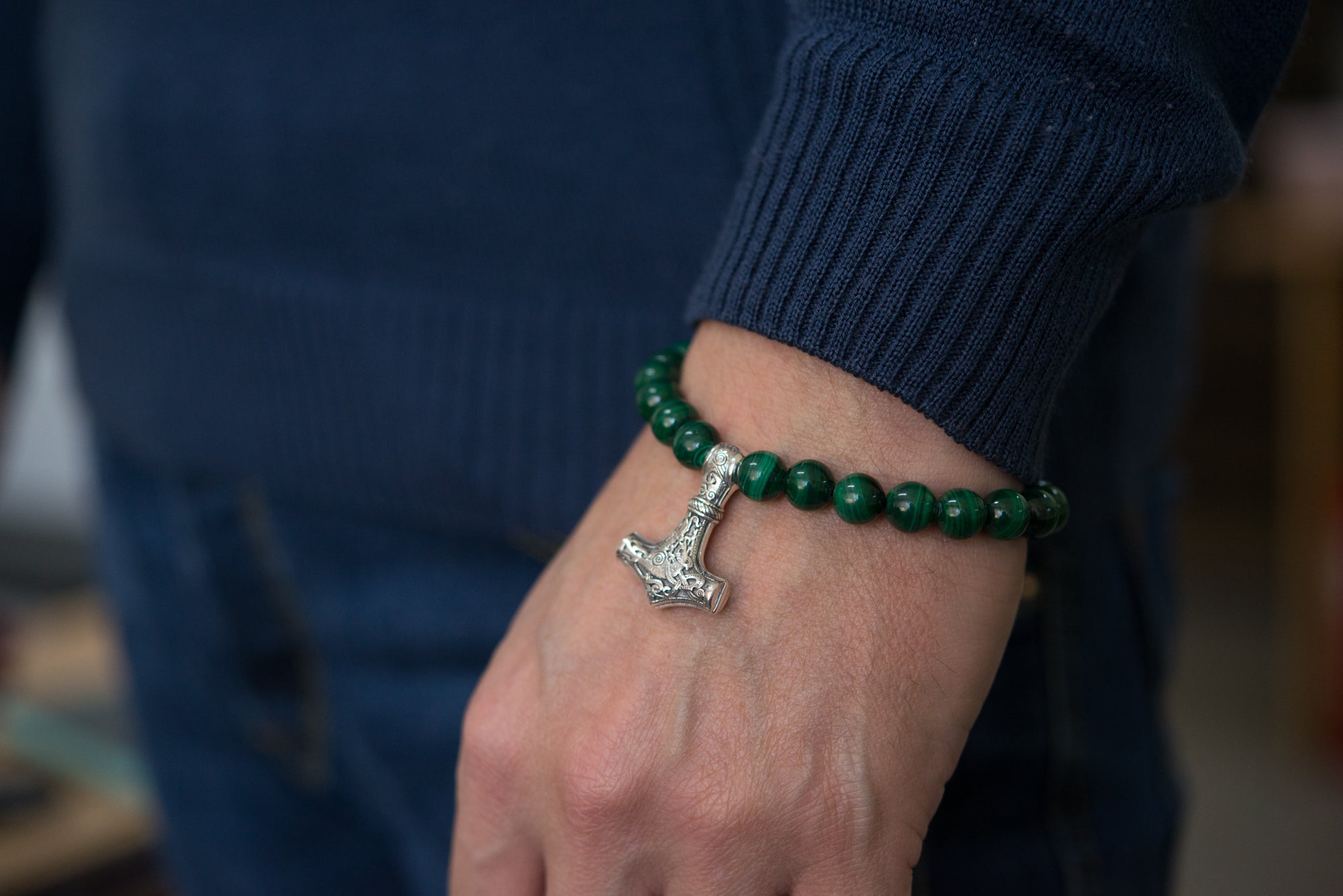 Malachite Bracelet with a Sterling Silver Thor’s Hammer Pendant