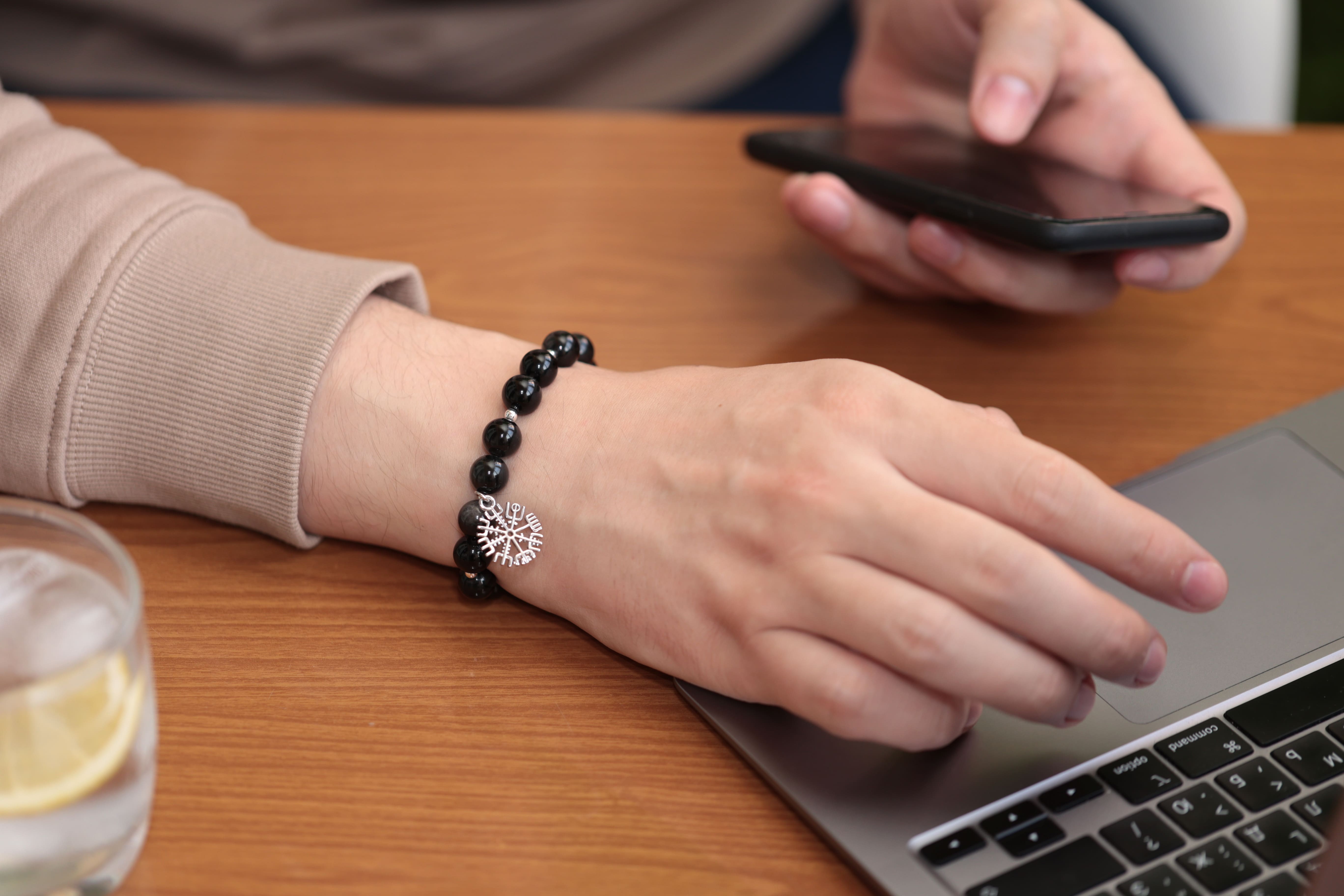 The bracelets are accented with sterling silver or bronze beads and pendants, including viking symbols such as Thor’s Hammer, Vegvísir, Valknut, and Ouroboros, that add subtle elegance and significance.