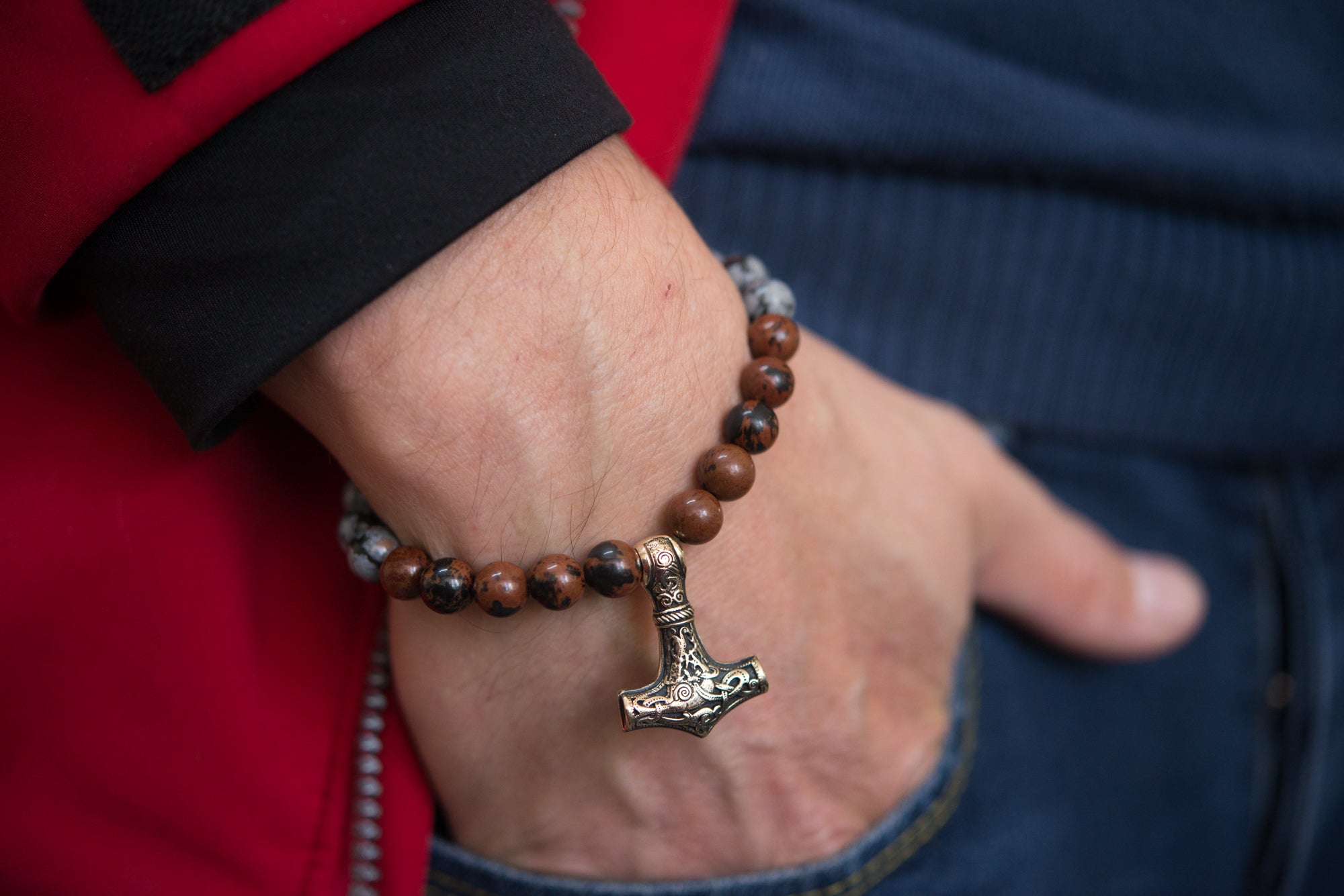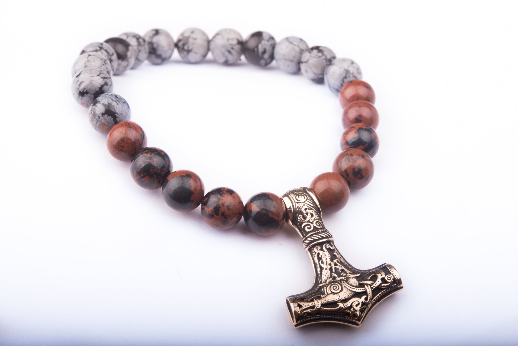 Obsidian Bracelet with a Bronze Thor’s Hammer Pendant (Snowflake Obsidian & Mahogany Obsidian)