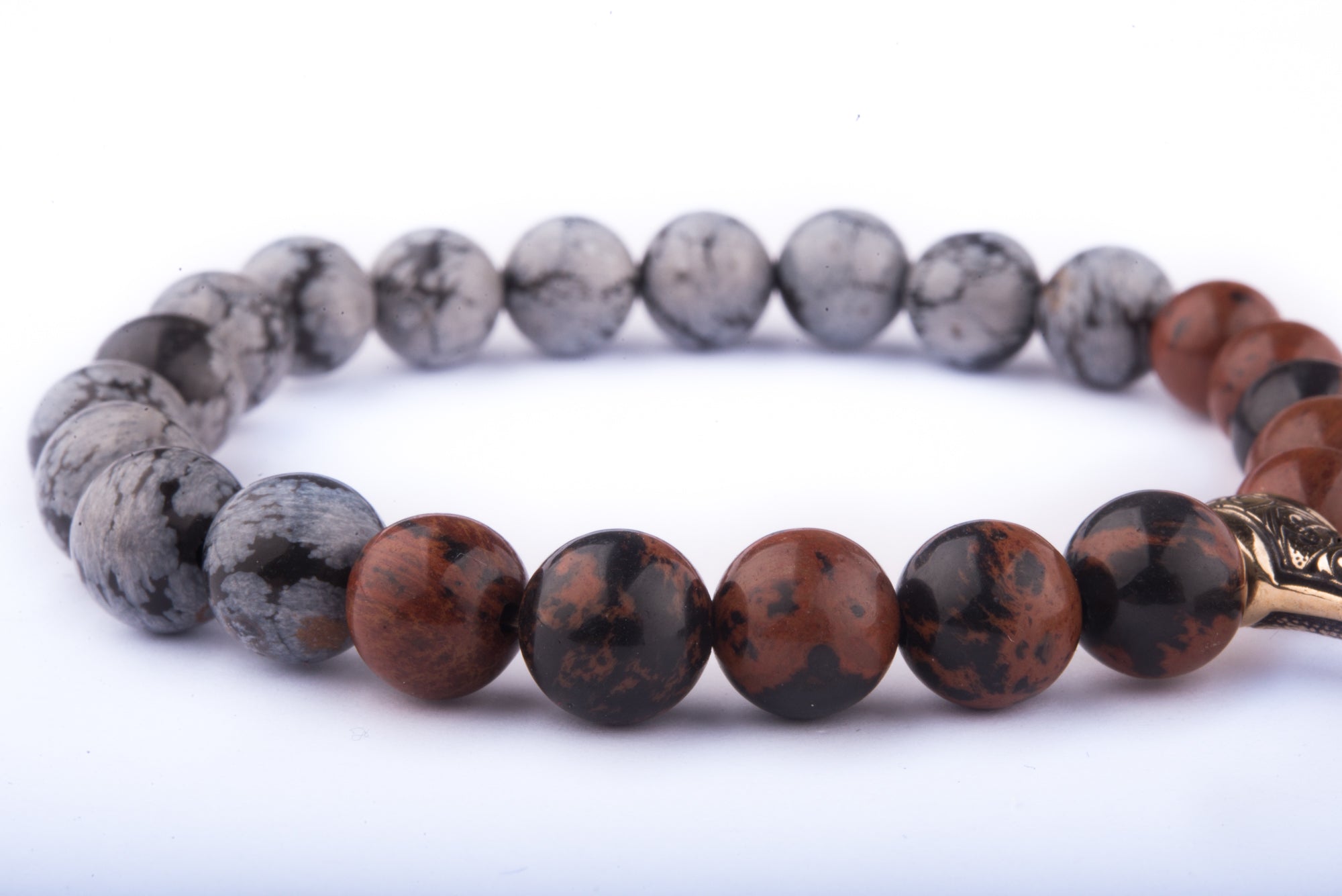 This bracelet combines two types of natural obsidian. Snowflake obsidian is valued for its contrasting grey-white crystal patterns and is traditionally associated with grounding and mental clarity. Mahogany obsidian, with its deep reddish-brown tones, is considered a mineral that supports strength, stability, and protection.