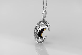 It depicts a fearsome mythical creature with a gaping mouth, eyes, and teeth.