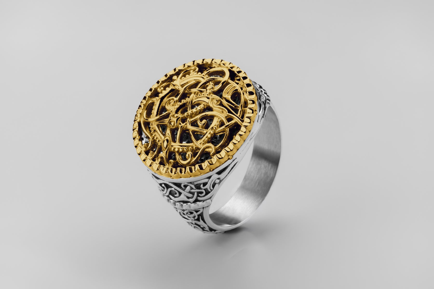 Like the original, the ring features an openwork design where a “ribbon animal” battles a serpent — a symbol of the eternal struggle between spirit and chaos.