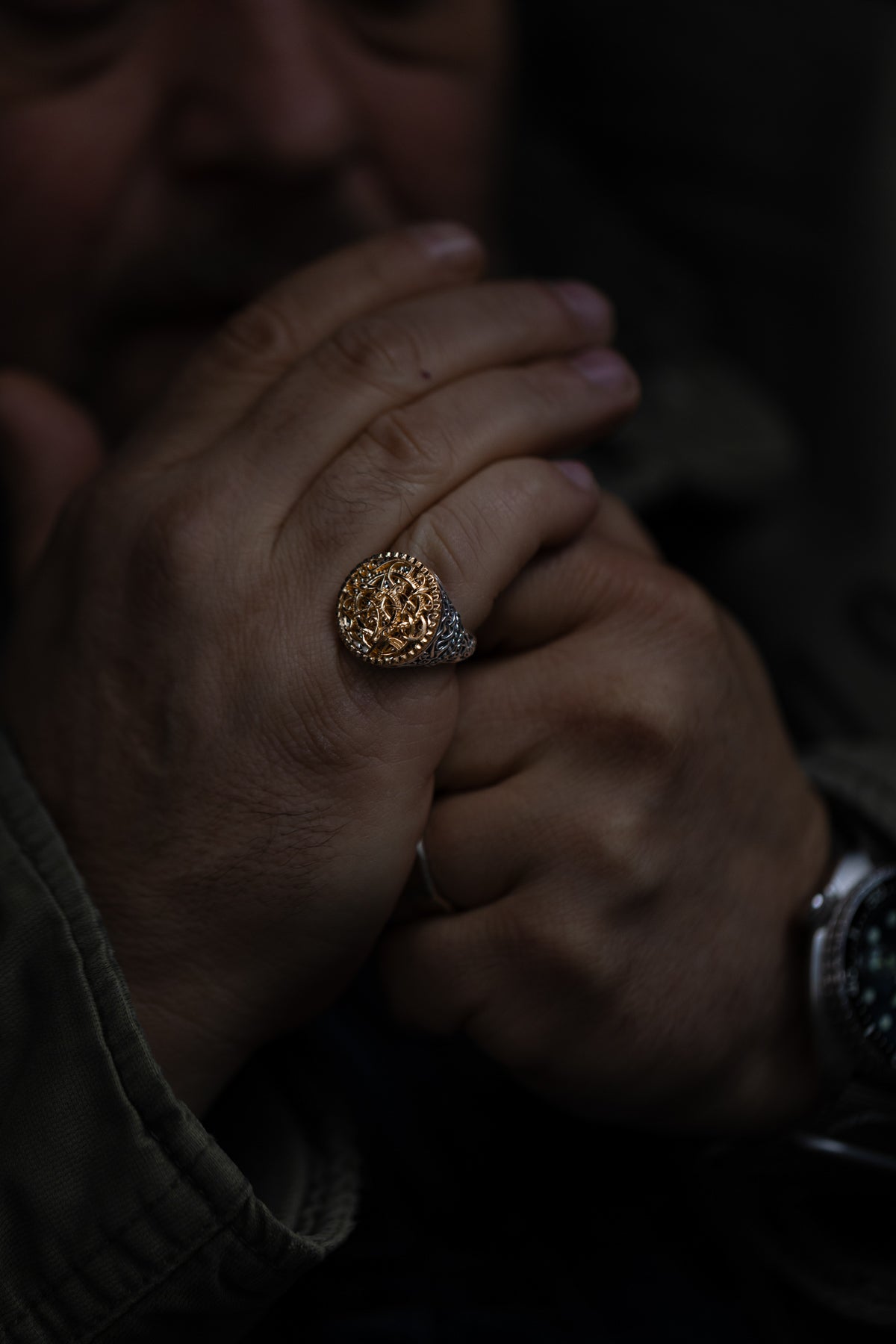 The central element of the ring is inspired by a historic disc brooch discovered in Pitney, Somerset (England), dating to around the 11th century.